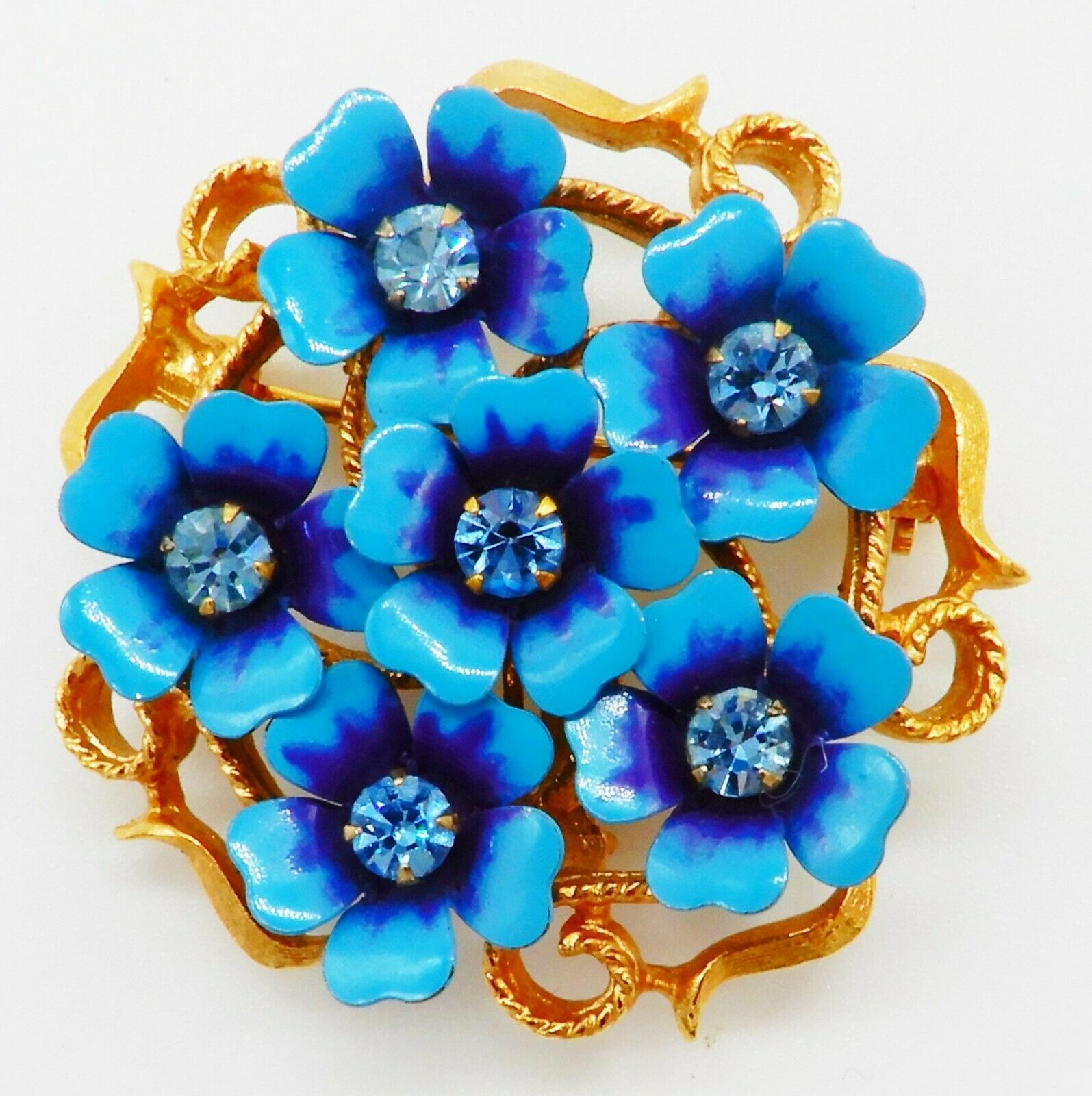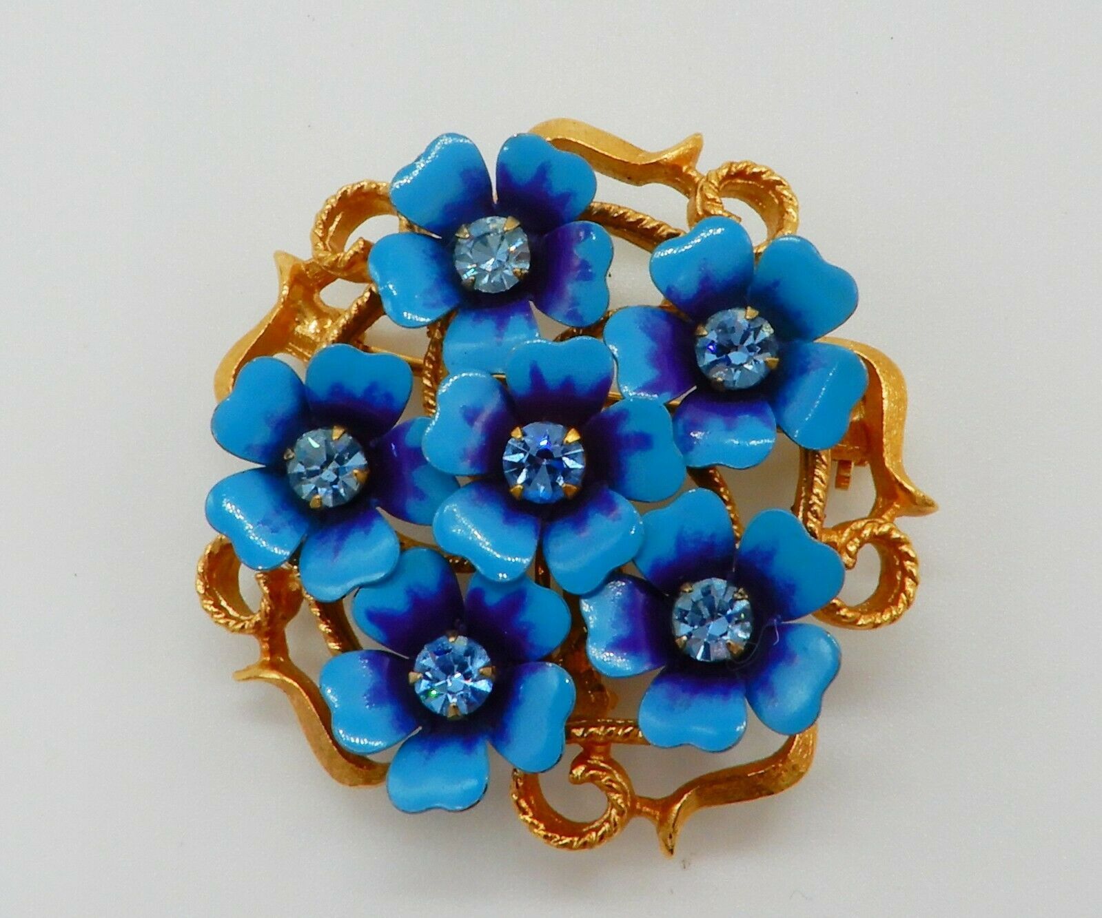 Vtg Avon gold tone & blue enamel over metal flower brooch with rhinestone center