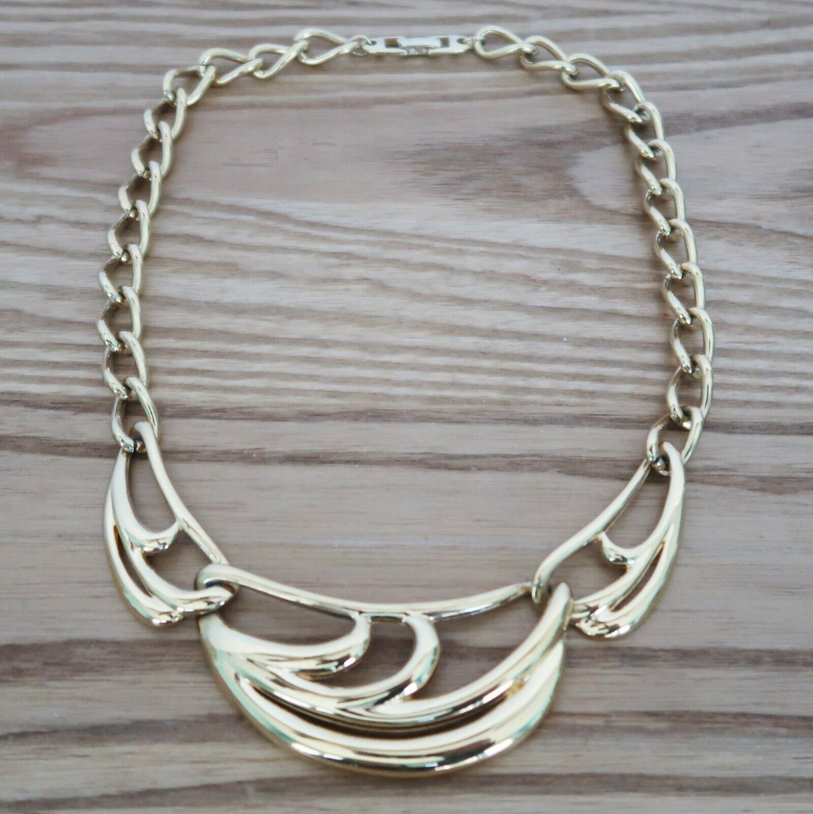 Vtg Napier gold tone princess length bib collar necklace w/ scrollwork center