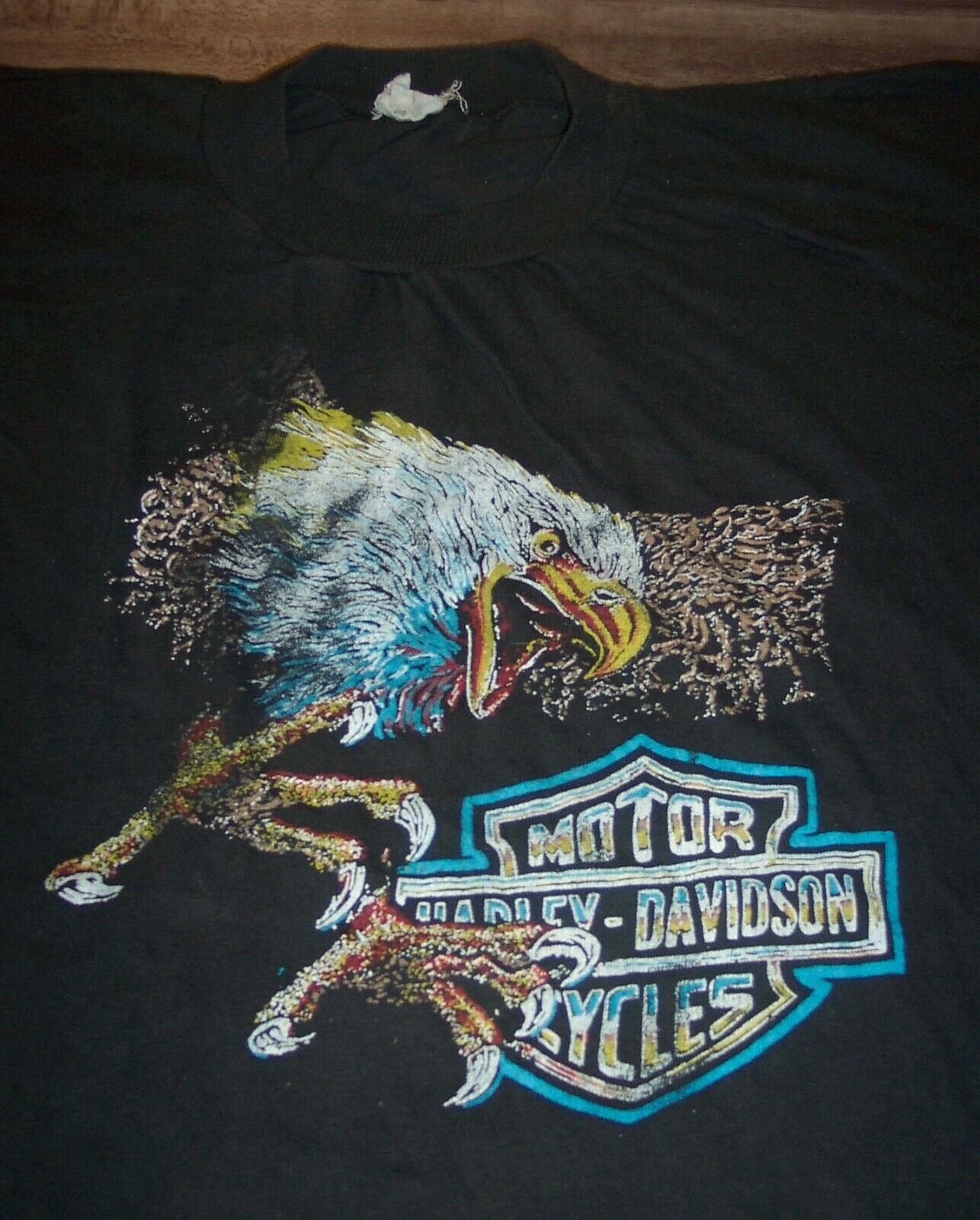 This is a Vintage HARLEY-DAVIDISON Motorcycles Eagle T-shirt. It is has no size on the tag, but measures like it is a size SMALL. It is 20 3/4 inches from armpit to armpit and 25 inches in length. It is a little shorter then a normal Small. Check measurements to make sure it will fit you good. It is in great condition. It is CLEAN. No Stains, Tears, or Defect. It has that real nice vintage minor wear. Awesome Rare Find. Combine auctions to save on shipping. EAD