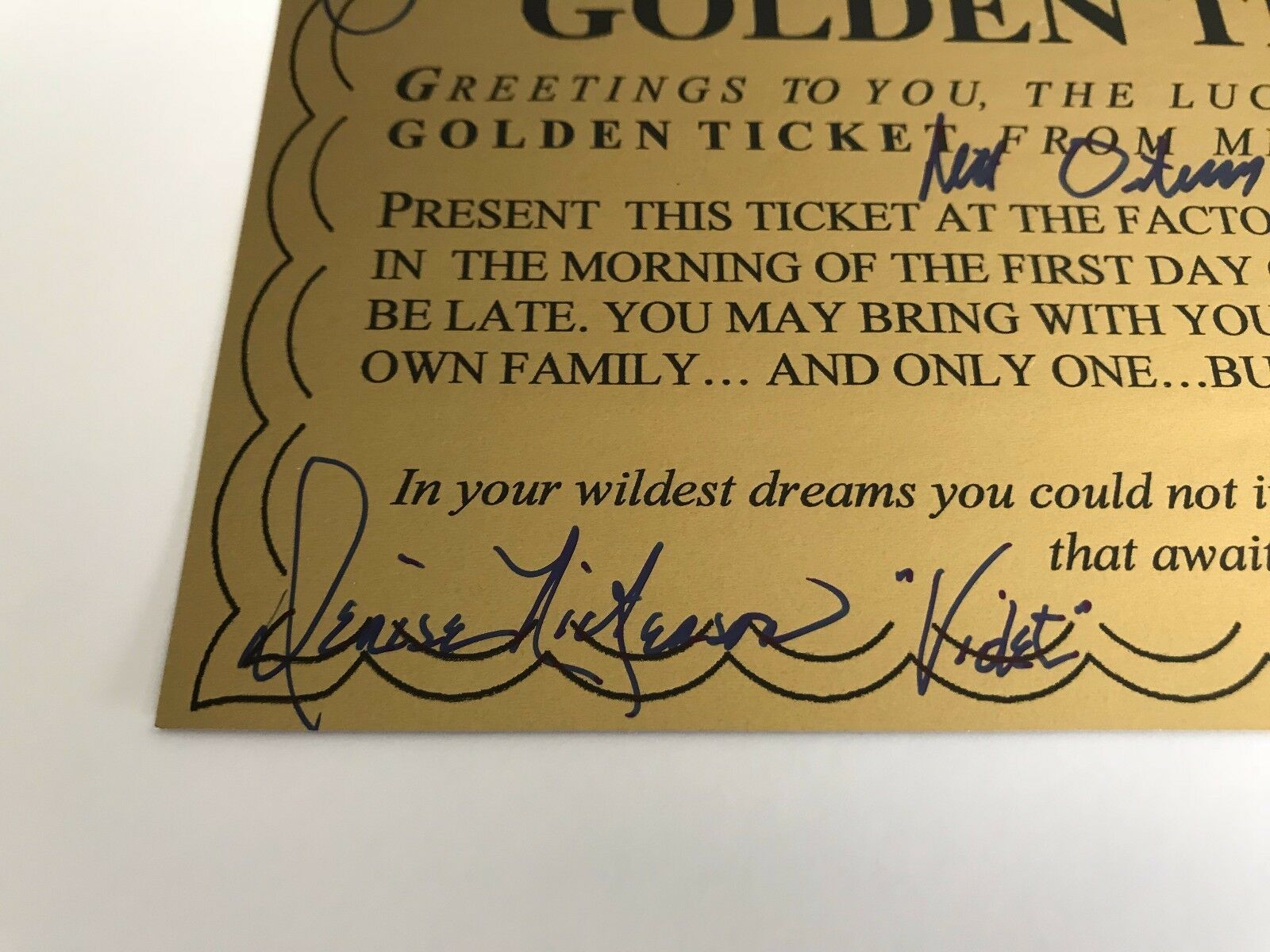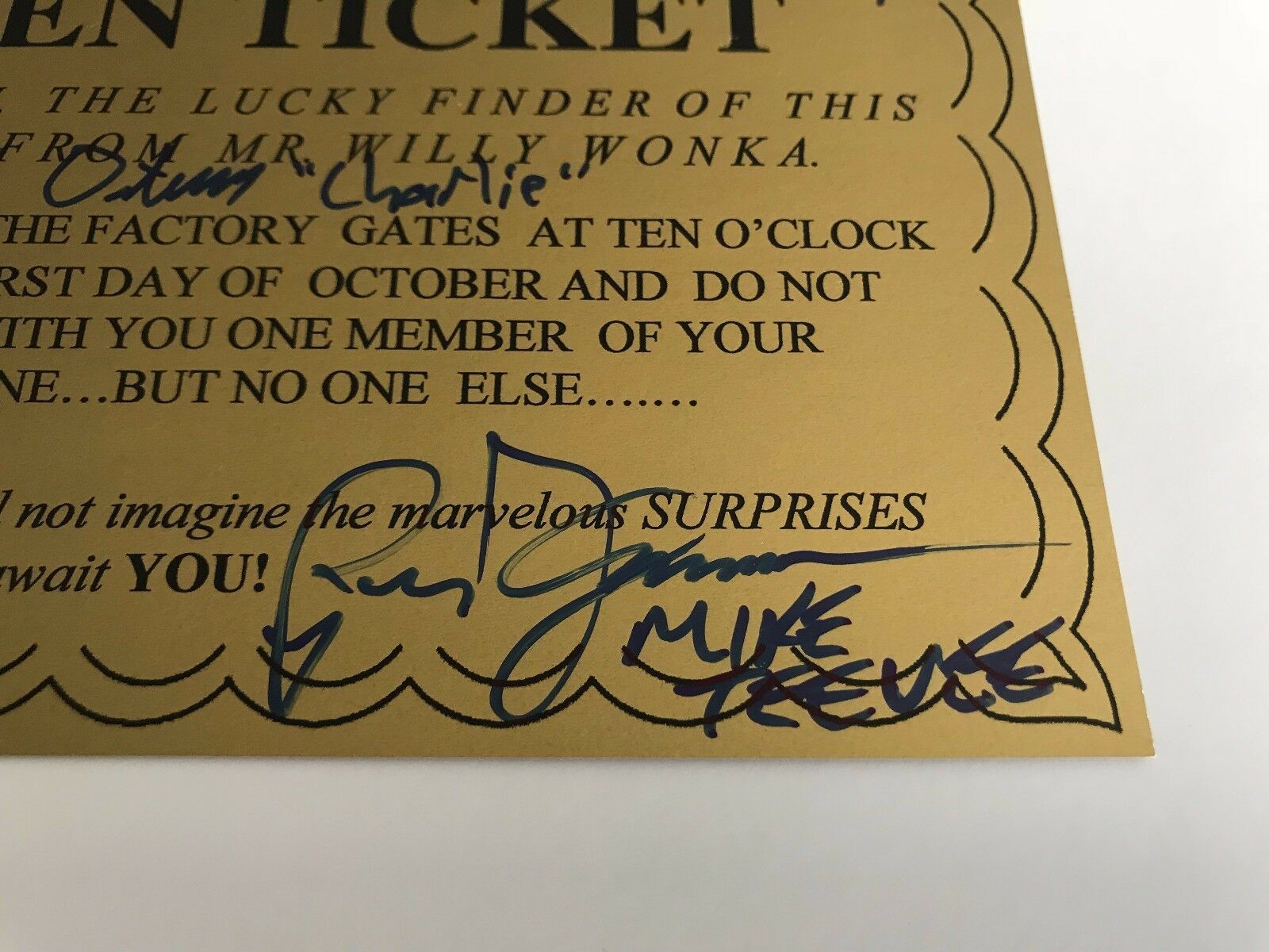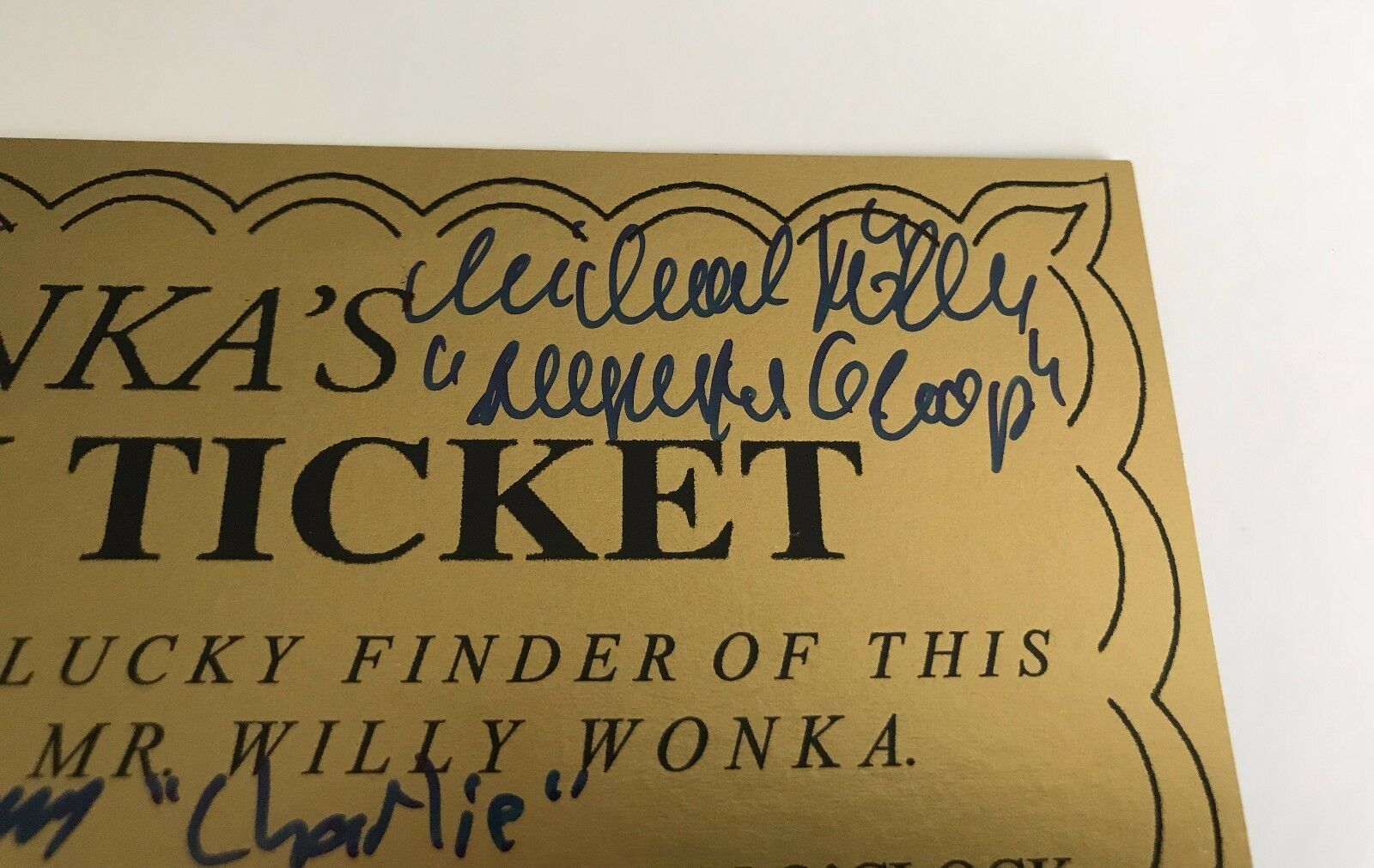 Details: This is an epic piece must have for any fan of the original Willy Wonka the Chocolate Factory Movie w/ Gene Wilder!! This is a Golden Ticket signed by all 5 original golden ticket winners in the movie! Wow!! This piece features the autographs of Peter Ostrum (Charlie), Julie Dawn Cole (Veruca Salt), Denise Nickerson (Violet Beauregard, rest in peace), Paris themed (Mike Teevee) Michael Bollner (Augustus Gloop)!! Each person even wrote their character name next to their signatures as well! This ticket itself measures approximately 4 1/4" x 7 1/4" is an exact replica from the 1971 movie! Fun fact: When you see golden tickets signed by the kids it is usually 1 of them or only 4. The toughest signature to get is Michael Bollner (Augustus Gloop) as he lives in Germany is left off most tickets. Unfortunately, also Denise Nickerson has now passed away which makes these that much harder to find with all 5 kids!