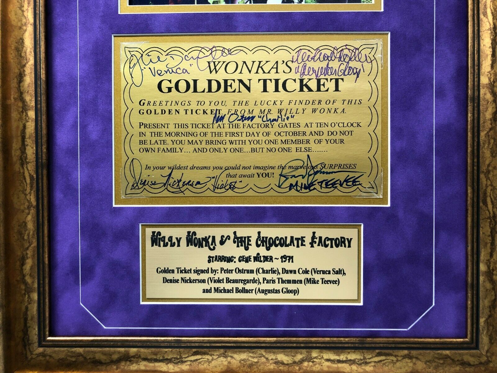 Item: Willy Wonka amp; The Chocolate Factory All 5 Kids Cast Signed amp; Framed Golden Ticket! Details: This is an epic piece amp; must have for any fan of the original Willy Wonka amp; the Chocolate Factory Movie w/ Gene Wilder!! This is a Golden Ticket signed by all 5 original golden ticket winners in the movie! Wow!! This piece features the autographs of Peter Ostrum (Charlie), Julie Dawn Cole (Veruca Salt), Denise Nickerson (Violet Beauregard, rest in peace), Paris themed (Mike Teevee) amp; Michael Bollner (Augustus Gloop)!! Each person even wrote their character name next to their signatures as well! This ticket itself measures approximately 4 1/4" x 7 1/4" amp; is an exact replica from the 1971 movie! Fun fact: When you see golden tickets signed by the kids it is usually 1 of them or only 4. The toughest signature to get is Michael Bollner (Augustus Gloop) as he lives in Germany amp; is left off most tickets. Unfortunately, also Denise Nickerson has now passed away which makes these that much harder to find with all 5 kids! AUTHENTICITY: This item has been certified authentic by one of the most reputable and recognized authenticators in the business today, JAMES SPENCE AUTHENTICATION (JSA). This item comes with a JSA numbered tamper-proof authentication sticker that can be reviewed amp; verified on their website 24/7/365. This item has been professionally museum quality custom framed in a gold frame with double suede matting. It features a gold laser engraved nameplate depicting information about the ticket and this movie. Item measures approximately 16" x 20" in size, includes a 5x7 photo of the cast and a glass display. Note: this is a stock item and you will receive a signed ticket where signature quality and location may vary.