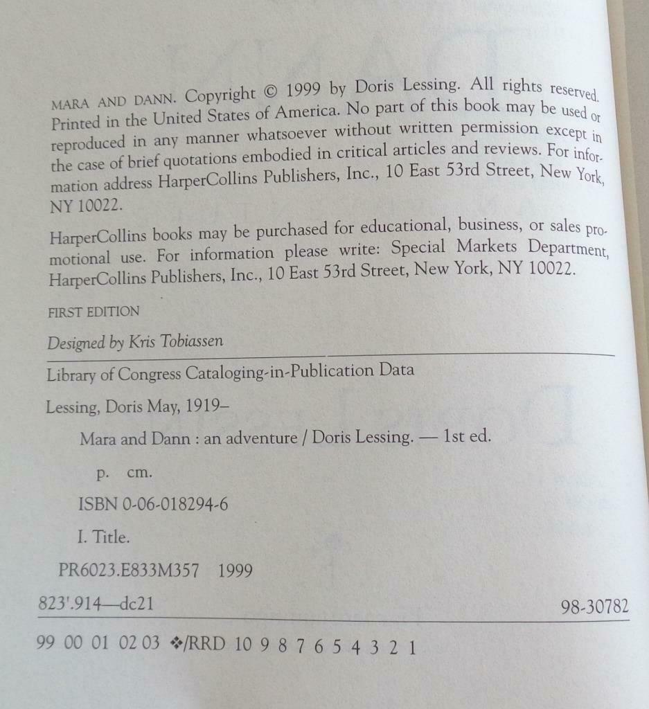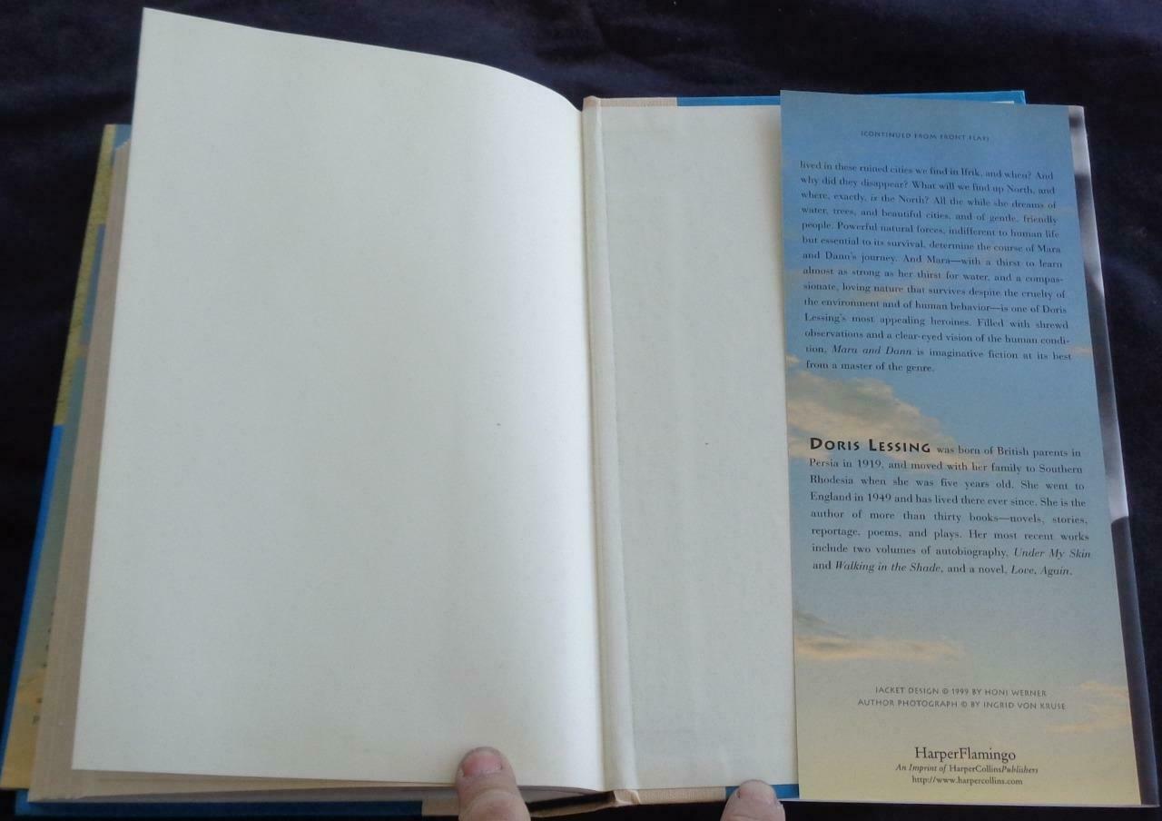 Offered here is this hard cover first edition of Mara and Dann, An Adventure by Doris Lessing. The book is a first edition with a copyright date of 1999. It was published by Harper Flamingo. It is in exceptionally good condition, with only very minimal wear at the corners and edges. The spine and binding are good, and all 407 pages are intact and in good condition. The paper dust jacket is also in good condition, with only very minimal wear. This is a nice book, and an entertaining read…