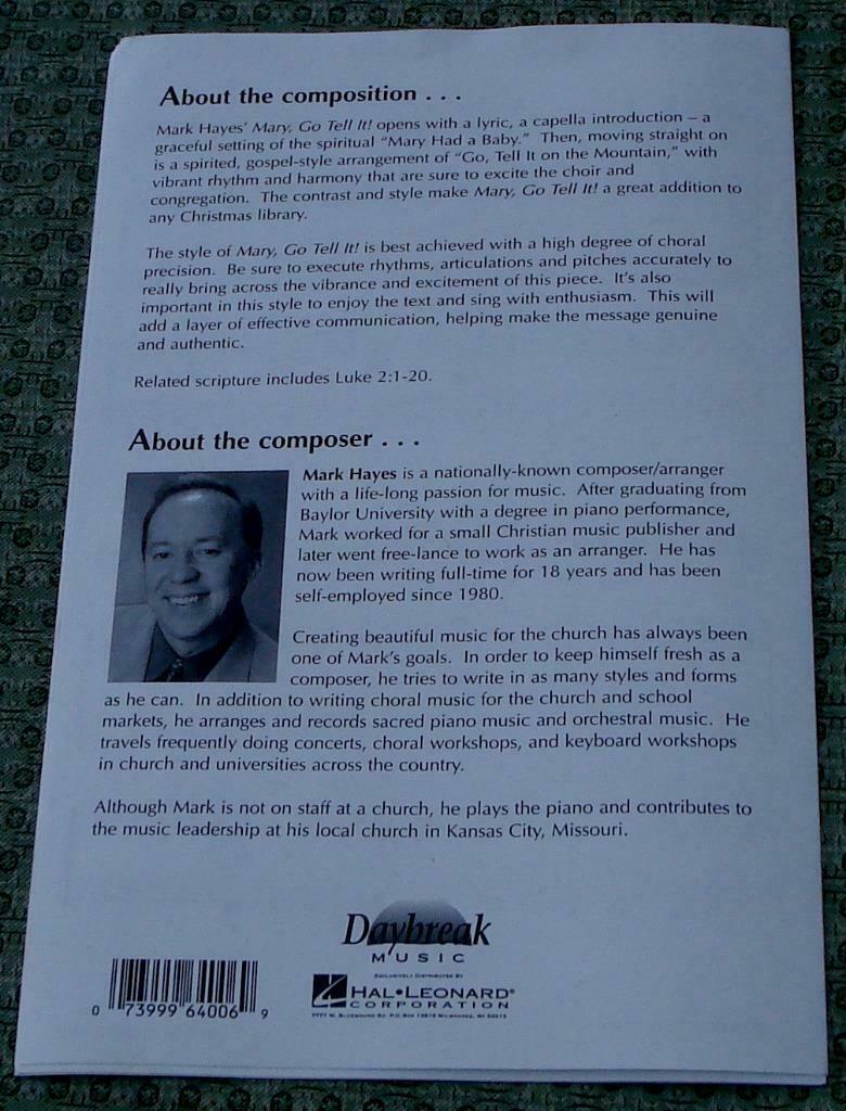 Mary, Go Tell It, Mark Hayes, 2001 OLD SHEET MUSIC - GREAT OLD RARE SHEET MUSIC