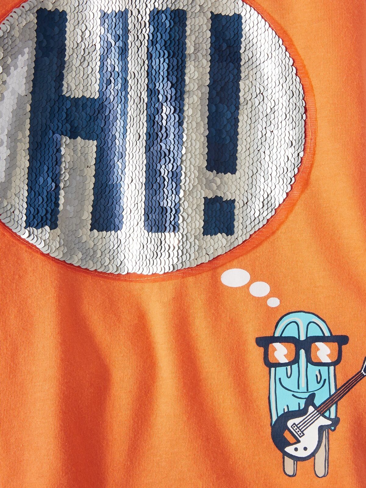Reversible sequin graphic on front with "Hi!" on one side and "Bye" on other side