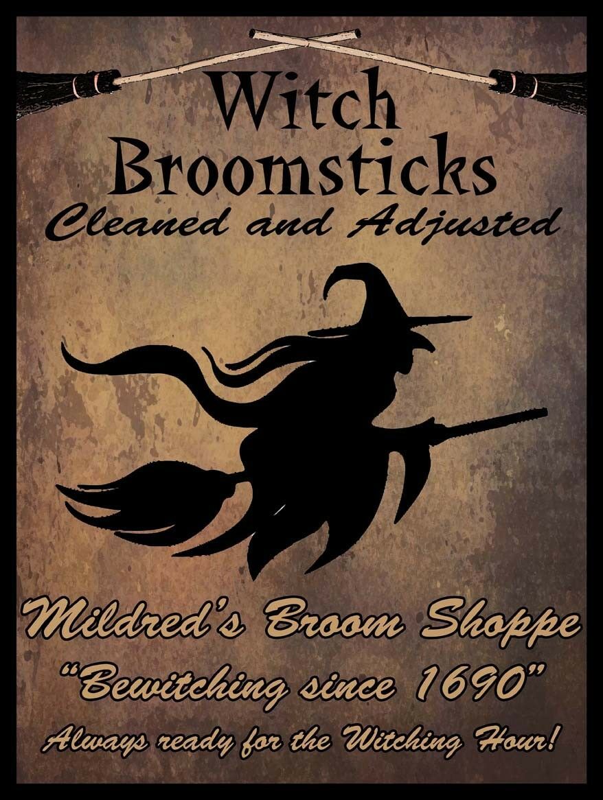 Witch Broomsticks Serviced Here Mildred's Broom Shoppe Halloween Metal Sign