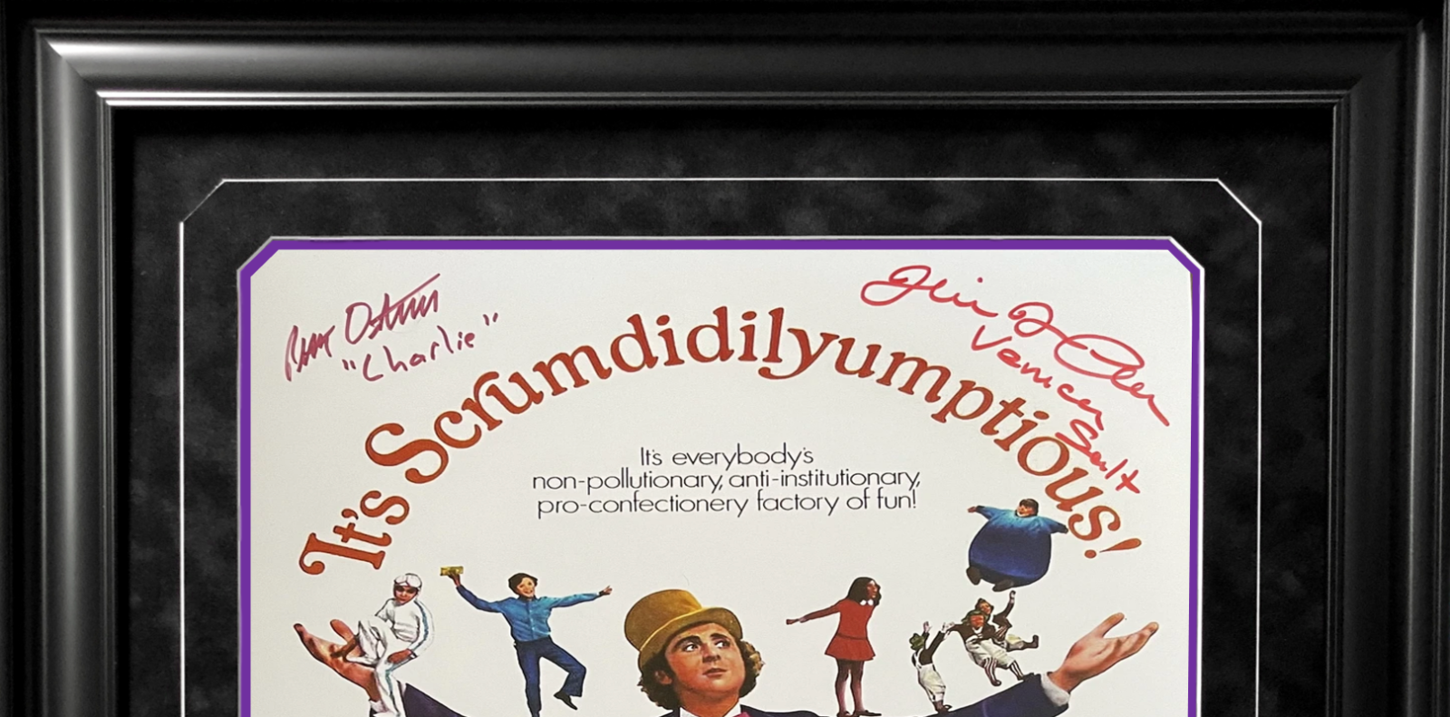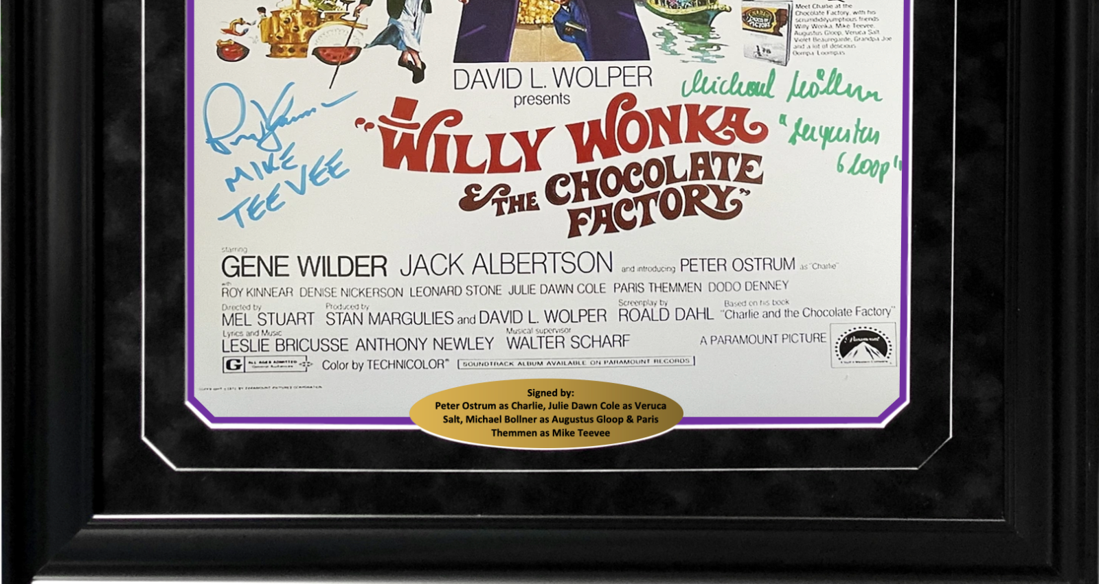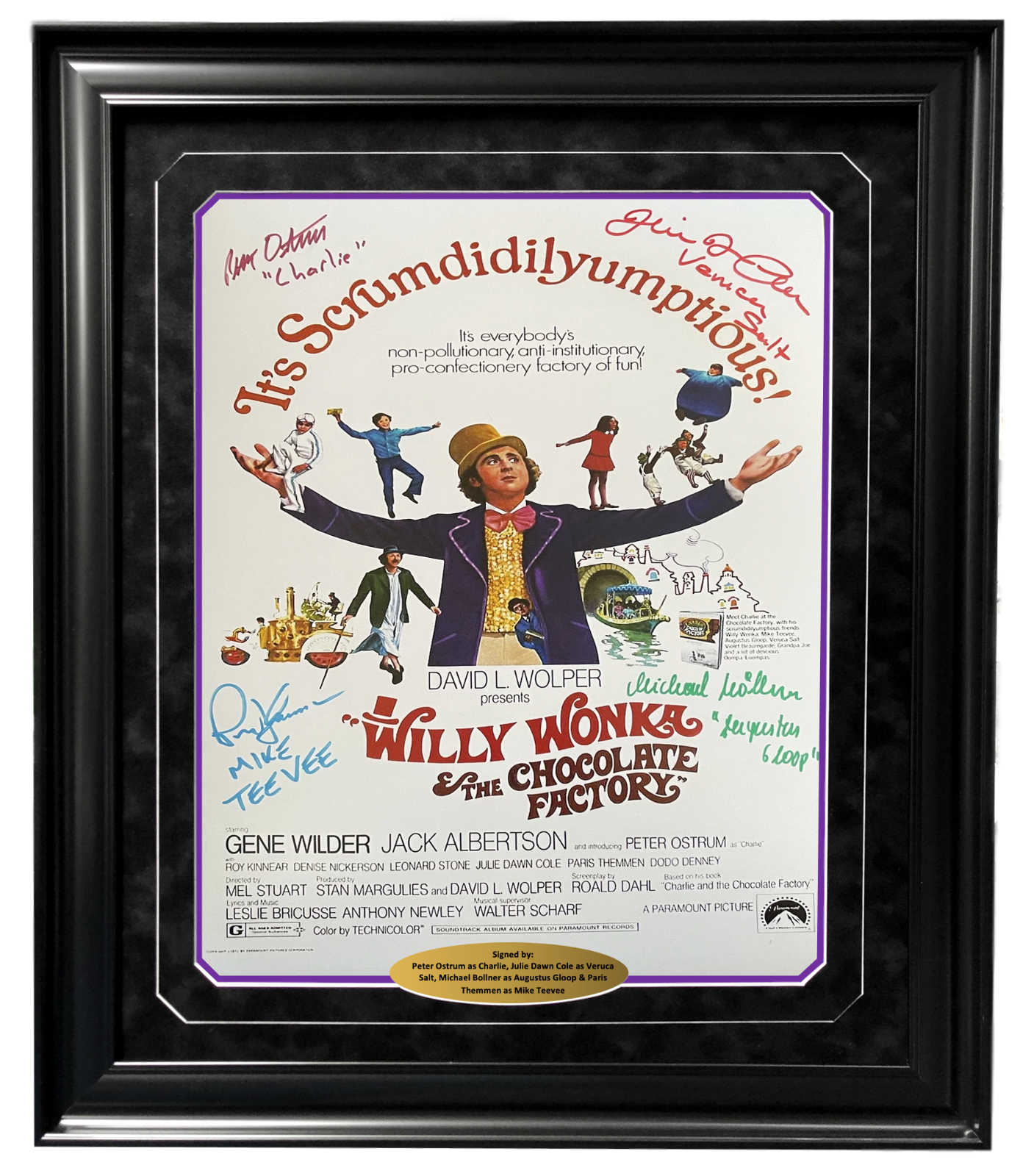 Item: Willy Wonka amp; The Chocolate Factory Kids Cast Signed amp; Framed 11x17 Movie Poster. Details: This is an epic piece amp; must have for any fan of the original Willy Wonka amp; the Chocolate Factory Movie w/ Gene Wilder!! This is a Golden Ticket signed by 4 of the original golden ticket winners in the movie! Wow!! This piece features the autographs of Peter Ostrum (Charlie), Julie Dawn Cole (Veruca Salt), Paris Themmen (Mike Teevee) amp; Michael Bollner (Augustus Gloop)!! Each person even wrote their character name next to their signatures as well! This poster itself measures approximately 11" x 17" in size and is an replica poster just like the one from when the movie was in theatres back in 1971! AUTHENTICITY: This item has been certified authentic by Inscriptagraphs Memorabilia guaranteeing the signature is Authentic and the real deal. It includes the Inscriptagraphs tamperproof hologram that could be matched up and verified forever on the Inscriptagraphs Online Authentication Database. We work directly with Paris Themmen who plays Mike Teevee in the movie where we acquired these items directly from a global signing with the rest of the cast of this movie. This item has been professionally custom framed in a black frame with double matting and a glass display. It features a gold laser engraved nameplate depicting information about the actors who signed the poster. Item measures approximately 16" x 22" size. Note: this is a stock item and you will receive a signed poster where the signature quality, ink color and location may vary.