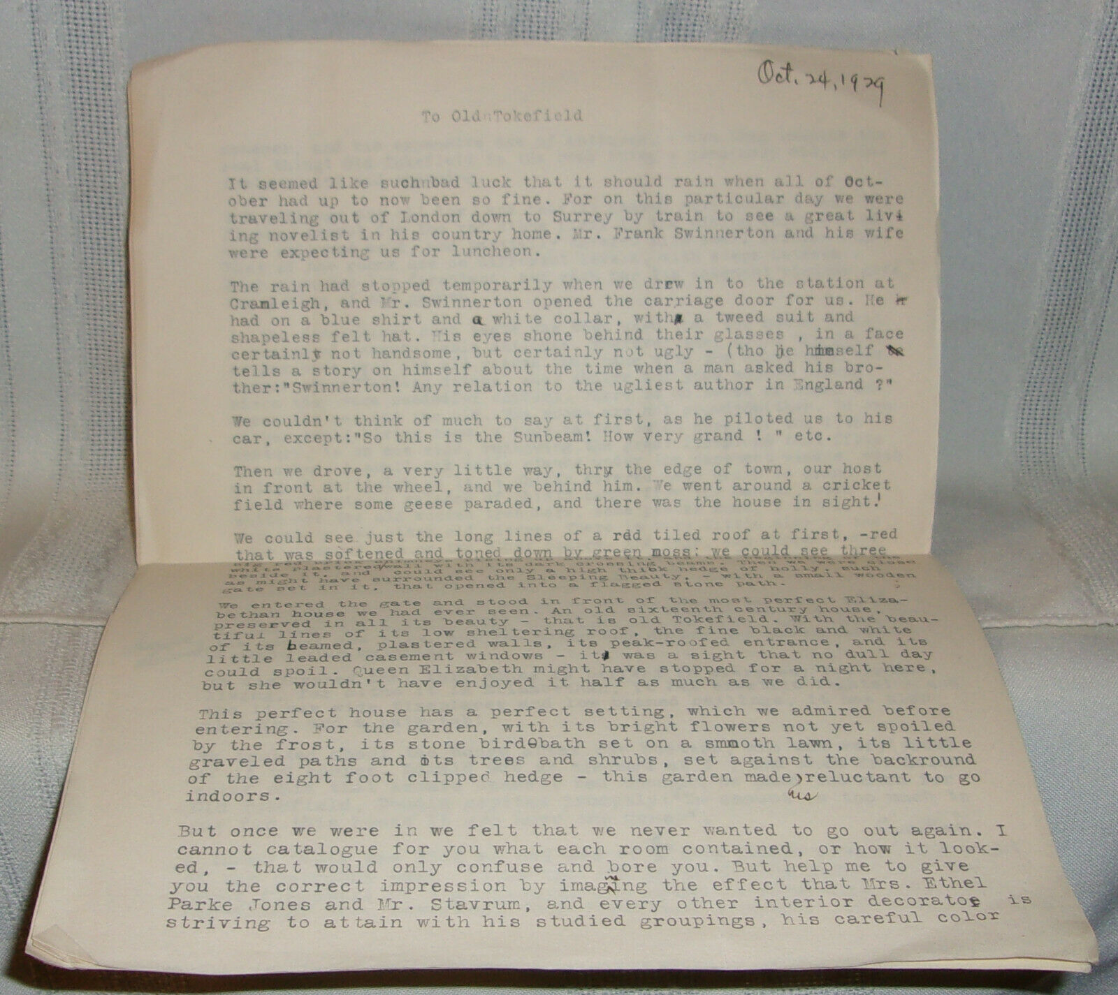 The typescript details the Bond's trip to England to visit Swinnerton at his sixteenth century house, Old Tokefield, Cranleigh, Surrey. The typescript is very descriptive with much information about the house, the furnishings, the inhabitants, their lunch with Swinnerton, and table conversation.
