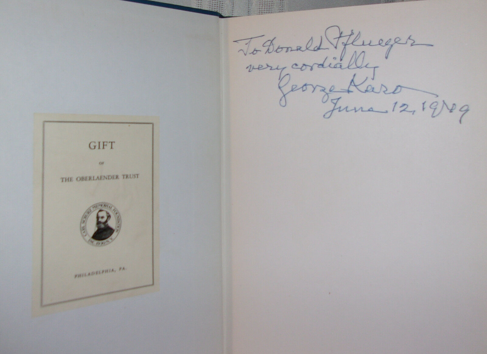 Inscribed to 'Donald Pflueger', (a professor who was also a highly acclaimed historian and author of numerous books on California history) and SIGNED and dated 1949 by George Karo to the front endpaper.