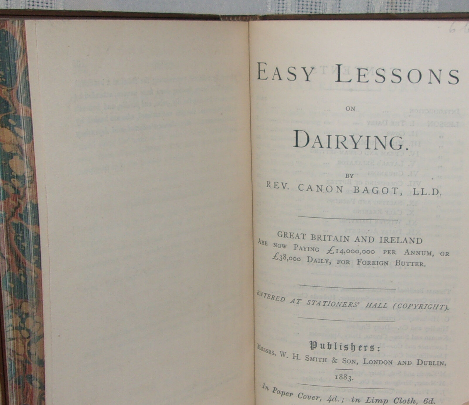 Easy Lessons on Dairying; Rev. Canon Bagot, LL.D; London and Dublin: W.H. Smith Sons, 1883. First edition.