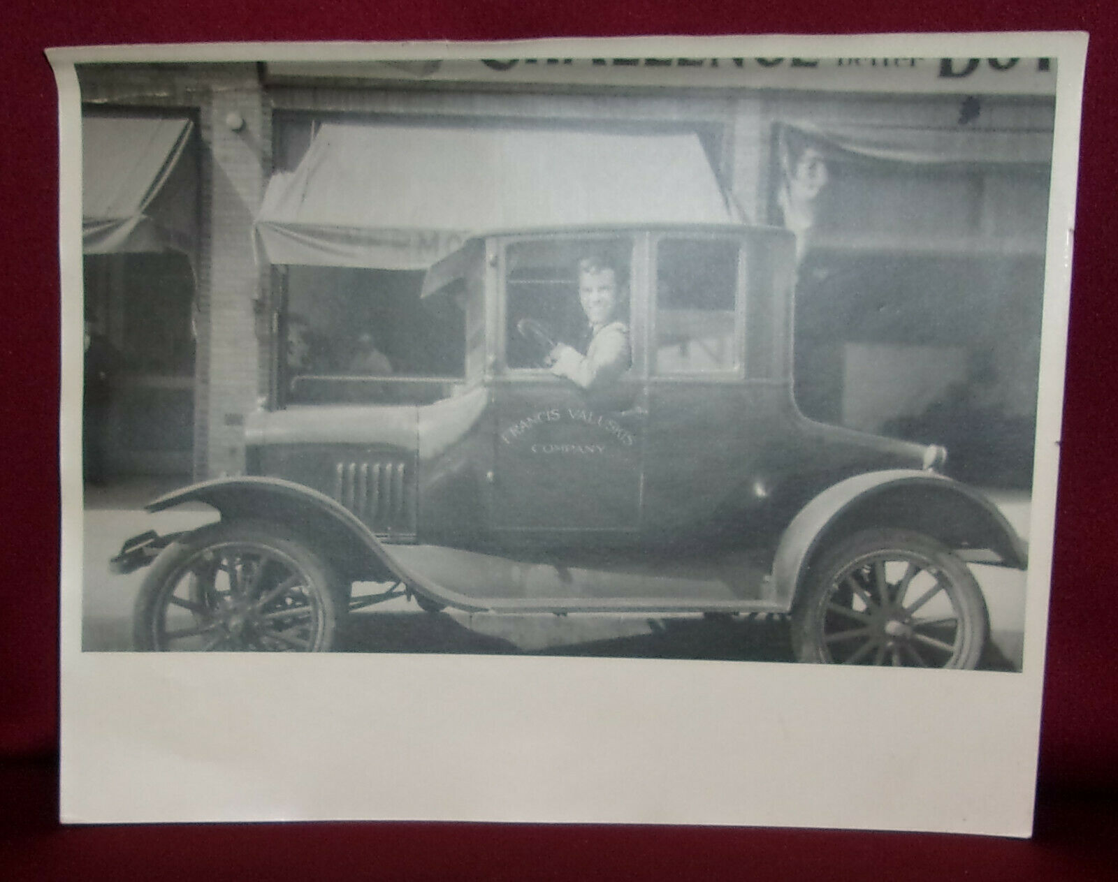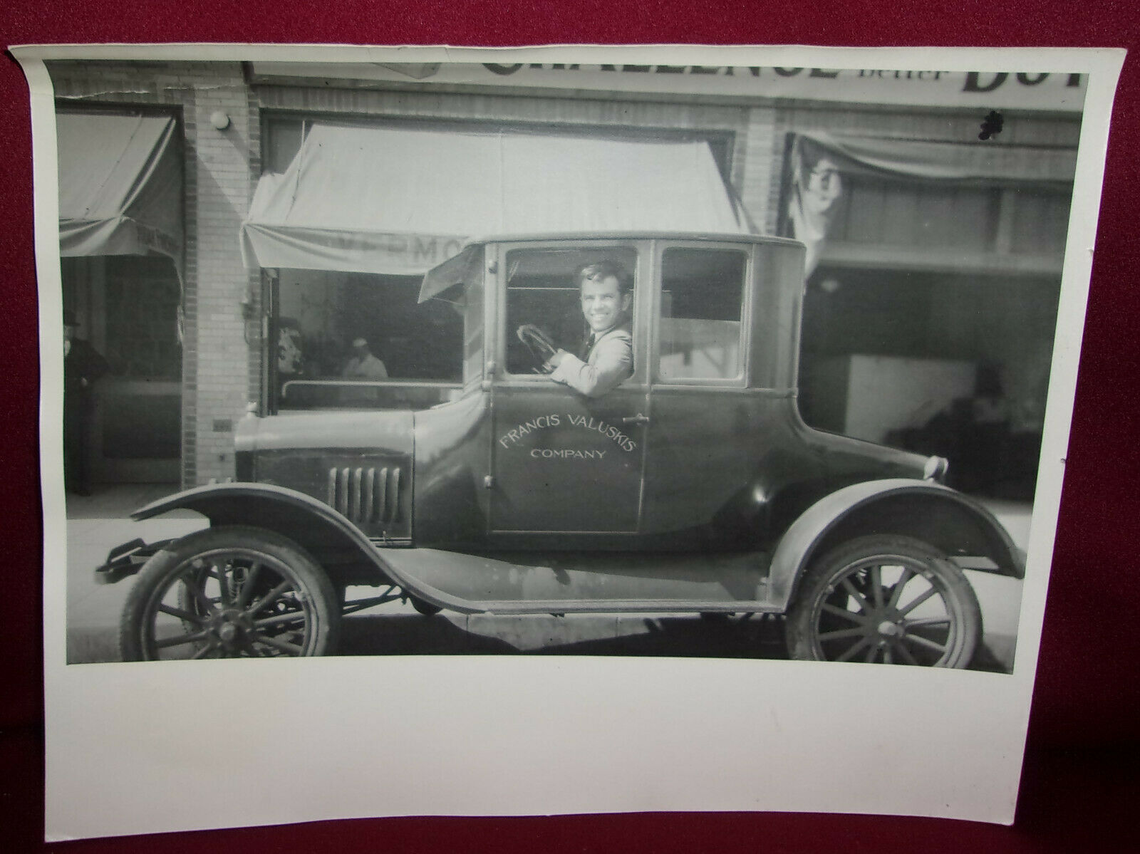 A smiling facial portrait of "Frank" Valuskis seated in his Ford Model T (circa 1920) car with "Francis Valuskis Company" painted on the door.