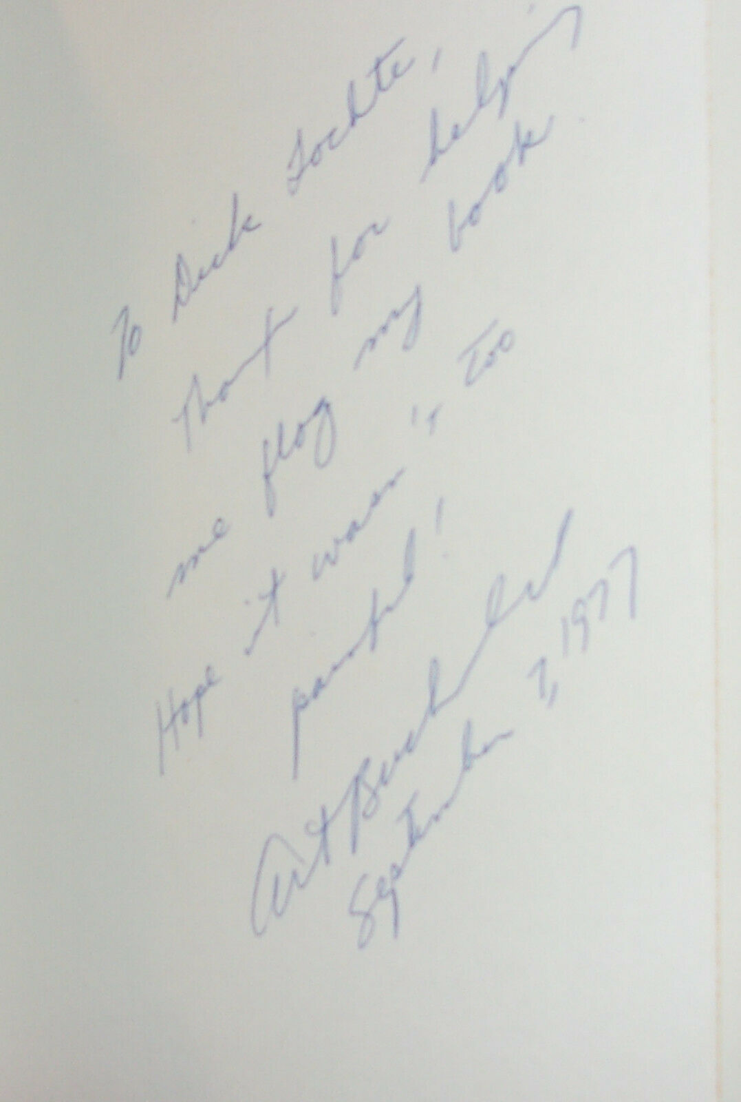 Warmly inscribed with humor to a mystery author/scriptwriter, dated 1977 and SIGNED by Buchwald to the first blank page.