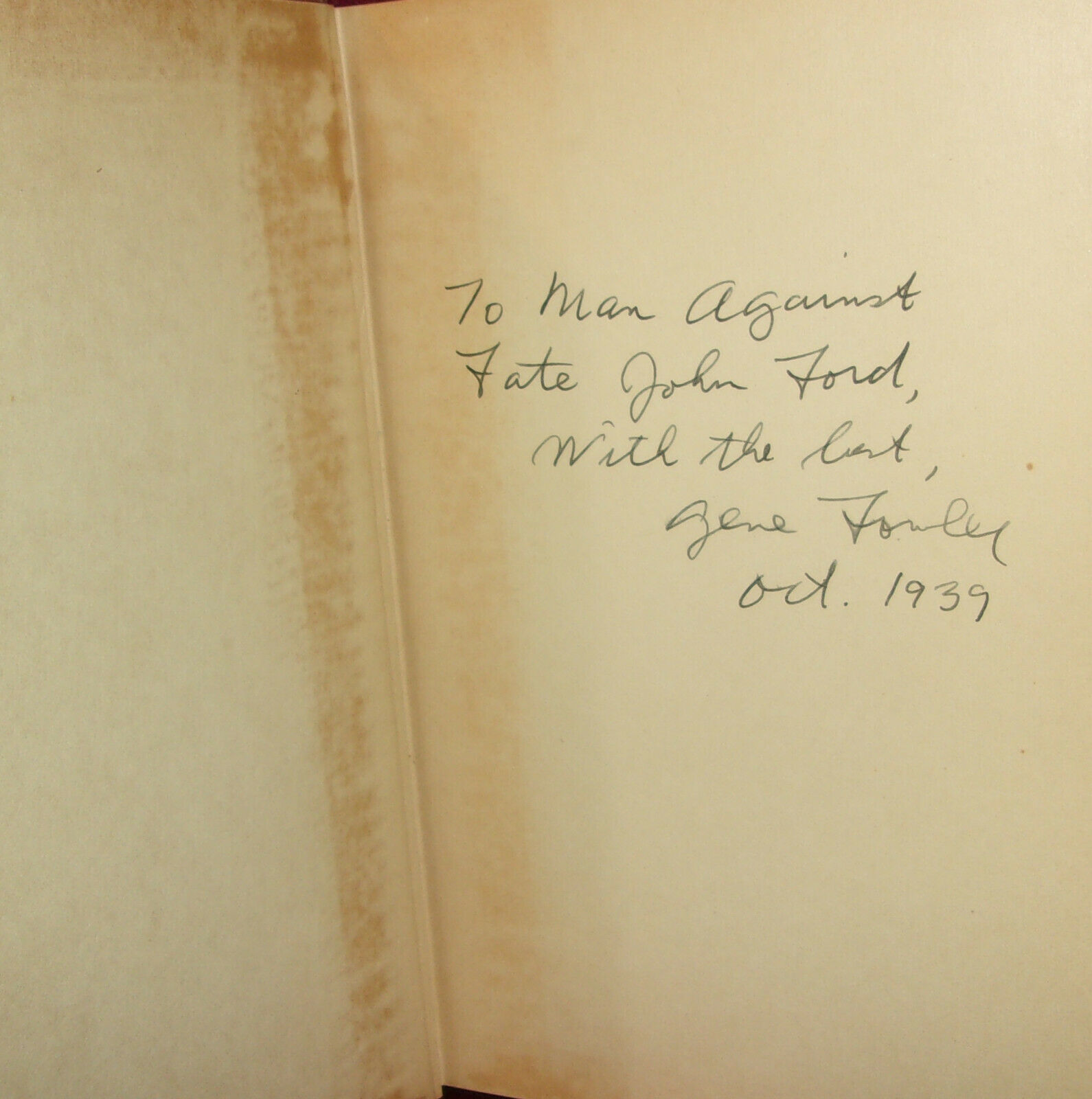 Director John Ford's copy with a gift inscription SIGNED by Gene Fowler: "To Man Against Fate John Ford, With the best, Gene Fowler/Oct. 1939." The book was published in October 1939.
