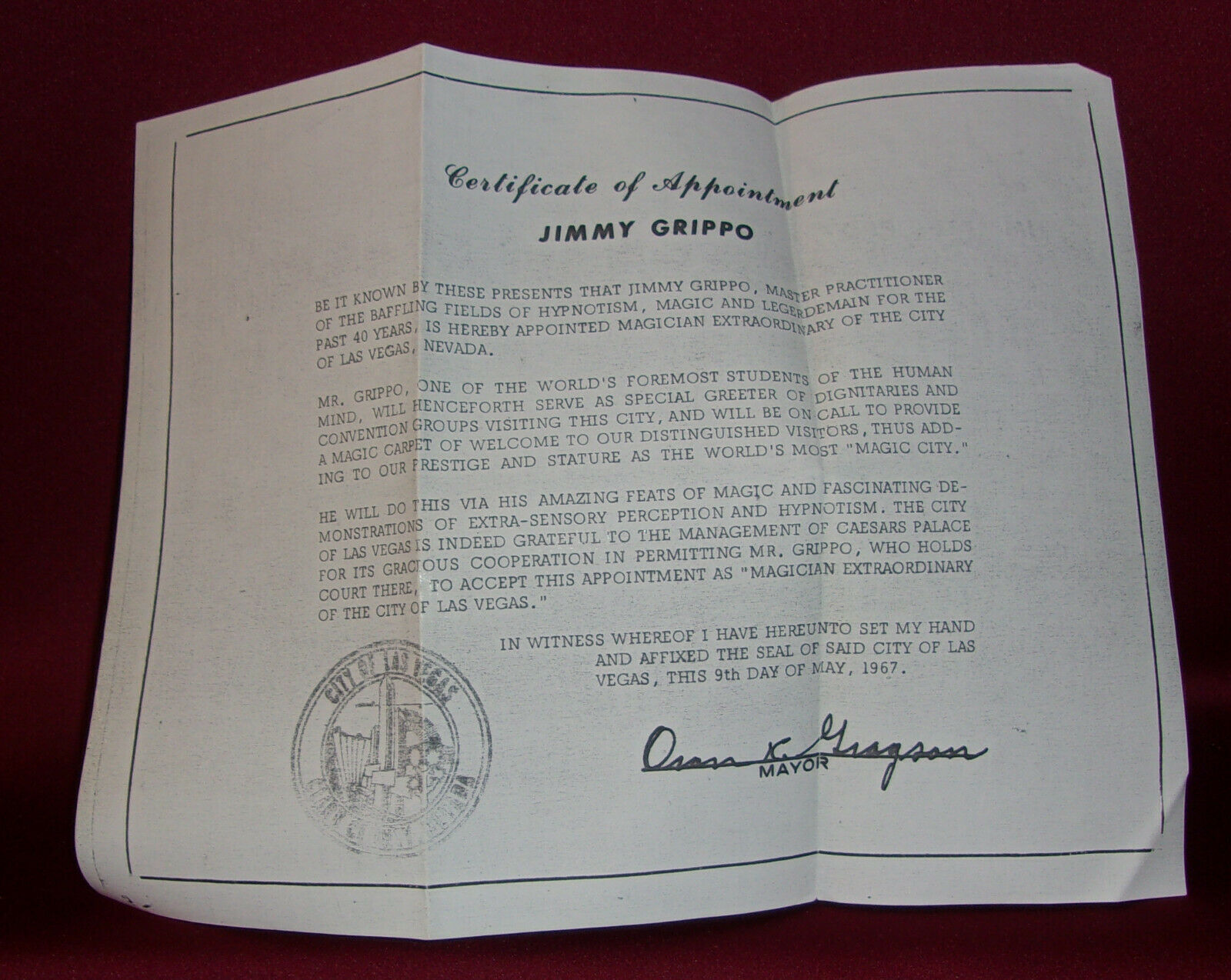 1). Folded facsimile of a 1967 Certificate of Appointment where Jimmy Grippo is made by the mayor "magician extraordinary" for the city of Las Vegas.