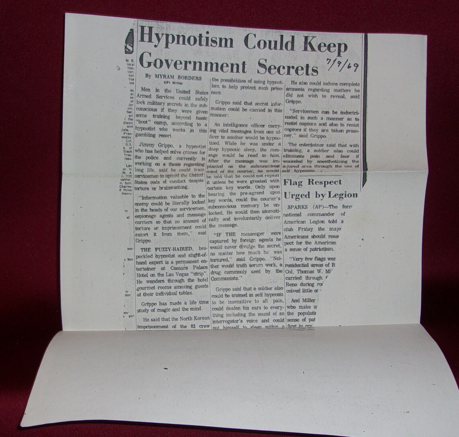 2). Copy of a newspaper article where Jimmy Grippo believes the government could use hypnotism for military purposes.