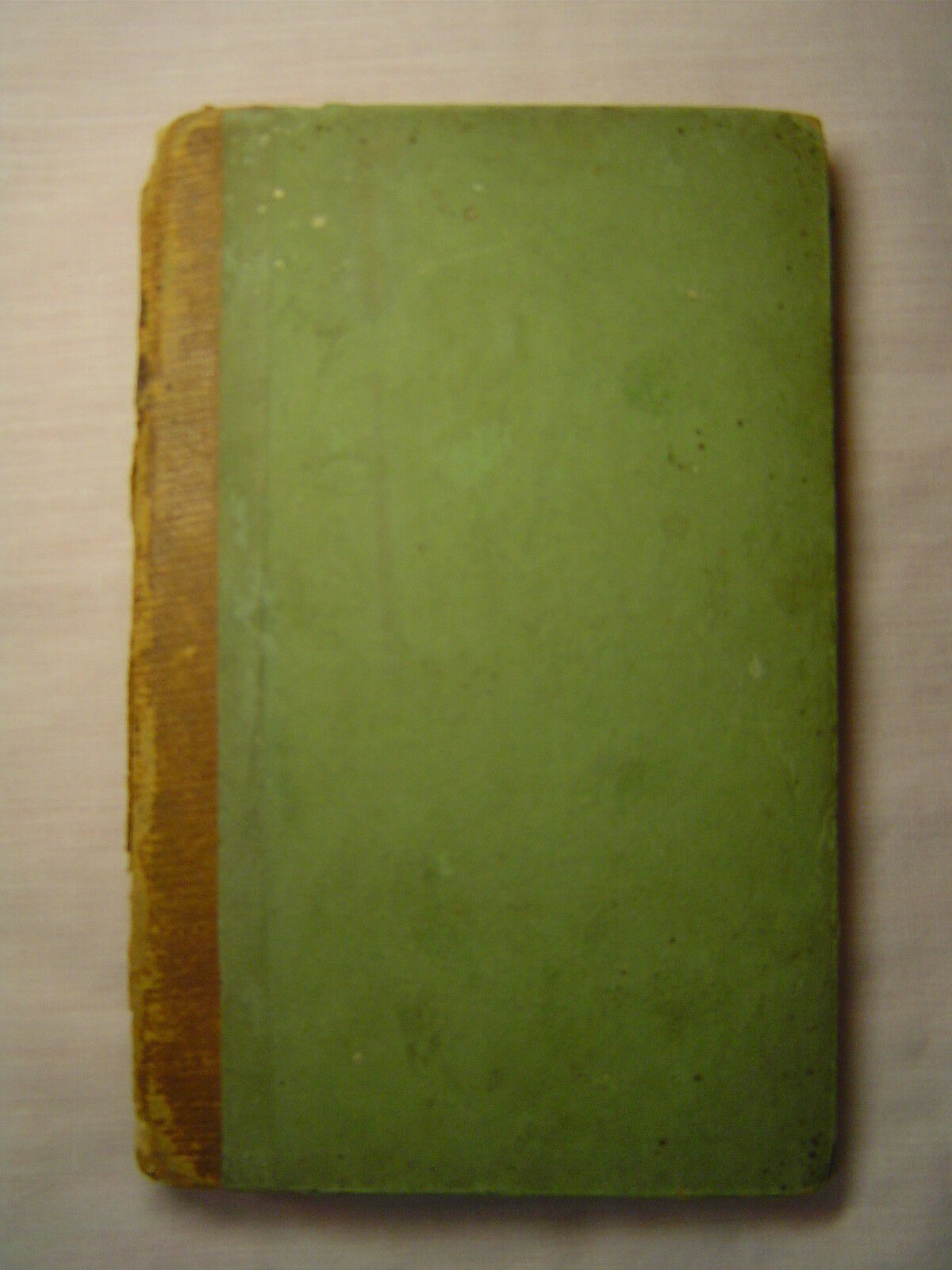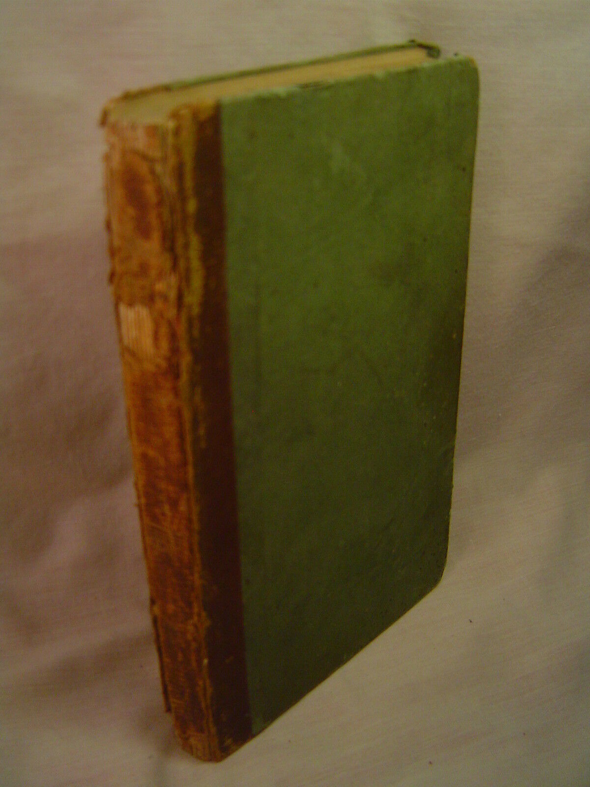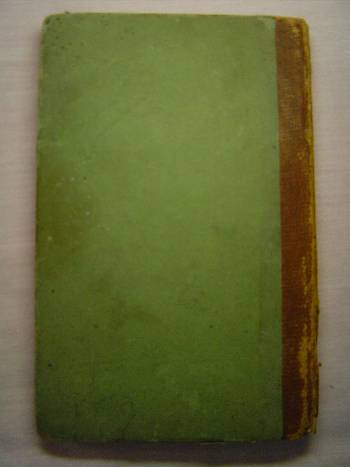 Condition is good to very good: bluish-green boards with half cloth binding on spine having gilt titles, boards worn on corners and stained, back cover cracked at hinge but holding, significant wear on spine with missing pieces, large stain on front free endpaper, wear along edges of boards; pages age-toned, have staining and foxing, endpapers split at hinge, back free endpaper loose, else most pages reasonably tight. Inside front cover has a glued-in bookplate for S. Weir Newmayer, M.D. (1877-1967) in Philadelphia. He authored nearly a dozen medical-related books in the early 20th century, including The Human Body and Its Care (1928) and Medical and Sanitary Inspection of Schools (1924). Has 144 pages. Size is 5-1/2" by 3-1/2". A book on moral instruction from the early 19th century, cons