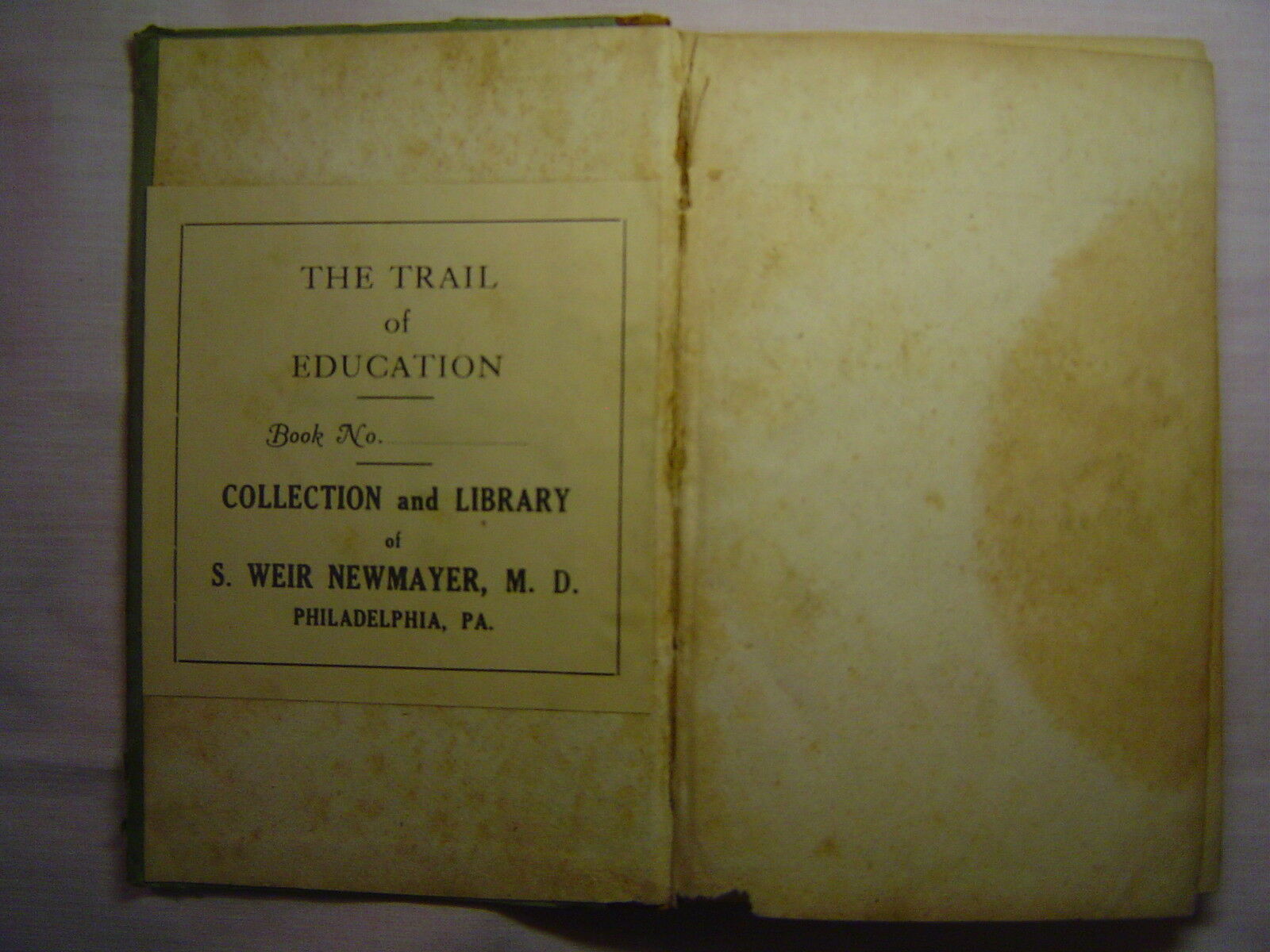Condition is good to very good: bluish-green boards with half cloth binding on spine having gilt titles, boards worn on corners and stained, back cover cracked at hinge but holding, significant wear on spine with missing pieces, large stain on front free endpaper, wear along edges of boards; pages age-toned, have staining and foxing, endpapers split at hinge, back free endpaper loose, else most pages reasonably tight. Inside front cover has a glued-in bookplate for S. Weir Newmayer, M.D. (1877-1967) in Philadelphia. He authored nearly a dozen medical-related books in the early 20th century, including The Human Body and Its Care (1928) and Medical and Sanitary Inspection of Schools (1924). Has 144 pages. Size is 5-1/2" by 3-1/2".