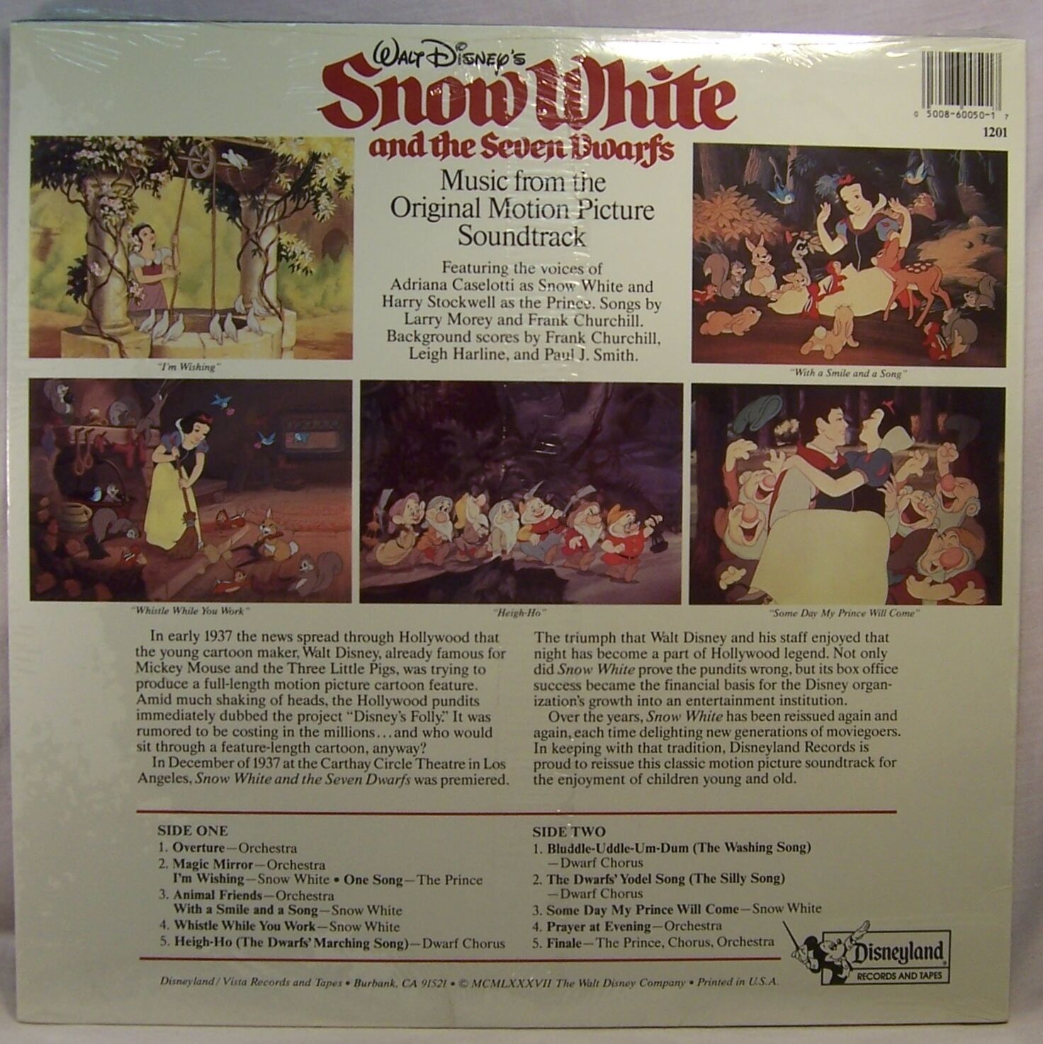 WALT DISNEY'S SNOW WHITE and the Seven Dwarfs Disneyland Record DQ-1201 MINT 1987 LP/SEALED PICTURE SLEEVE FACTORY SEALED/UNOPENED! Beautiful high gloss cover with film cels on the rear cover! Music from the original sound track of the motion picture A RARE MODERN ISSUE! PLEASE VIEW OUR STORE FOR MORE ITEMS THANKS!