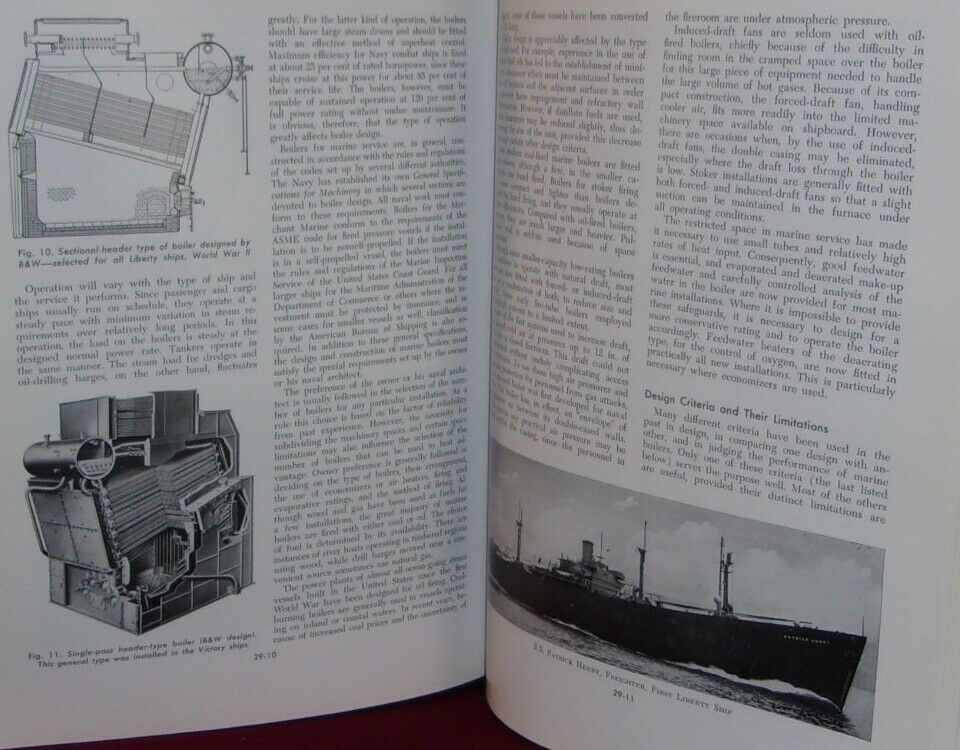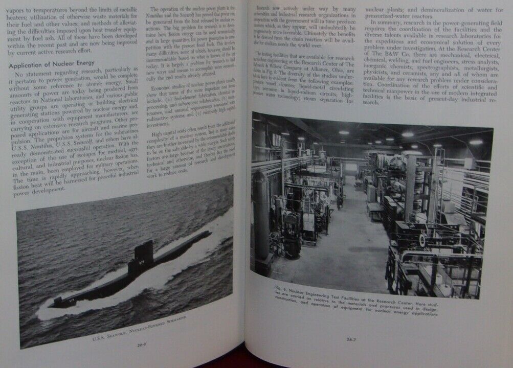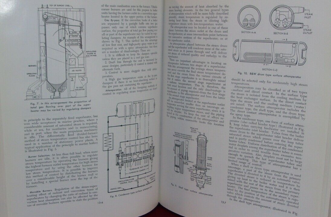 The ultimate book on modern steam technology, from The Babcock Wilcox Company of New York. Describes every aspect of the utilization of steam power. The basics are well covered: thermodynamics and fluid dynamics, energy cycles, combustion principles, steam generation, boilers, superheaters, reheaters and stokers. Then, specific applications like the paper industry, metallurgy, ships, submarines, and nuclear power. This book is absolutely packed with diagrams, nomographs, charts and photo illustrations; and there is every conceivable formula relating to all aspects of the science. Although this book is vintage (dated 1960), it is completely relevant technologically, since steam science is integral to the nuclear power industry (heat from fission produces steam that rotate turbines to generate electricity). An amazing technical book in great shape and a good price.