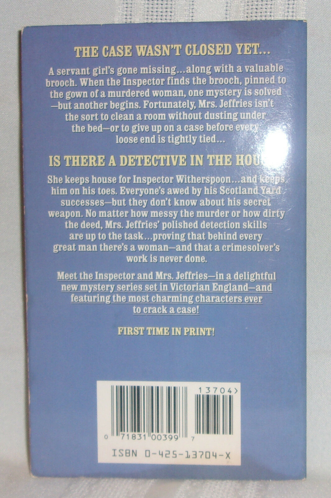 In her second outing Mrs. Jeffries finds a missing servant girl that is connected to a stolen brooch found on a dead body.