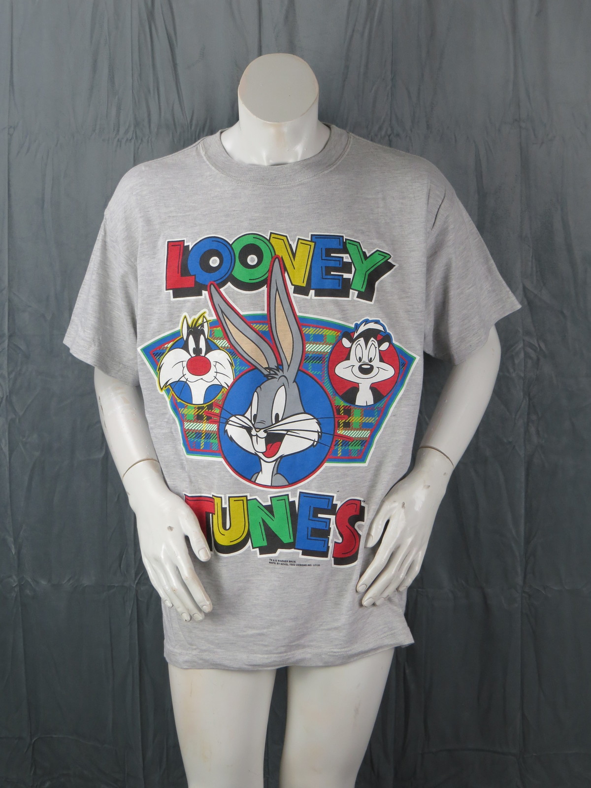 Up for sale is a vintage graphic t-shirt. It has a grey base colour. The front of the shirt has a huge looney tunes graphic which has a plaid background. Bugs bunny is in the middle of the graphic with Sylvester on one side and Pepe on the other side. What an amazing vintage shirt do not miss out on it.