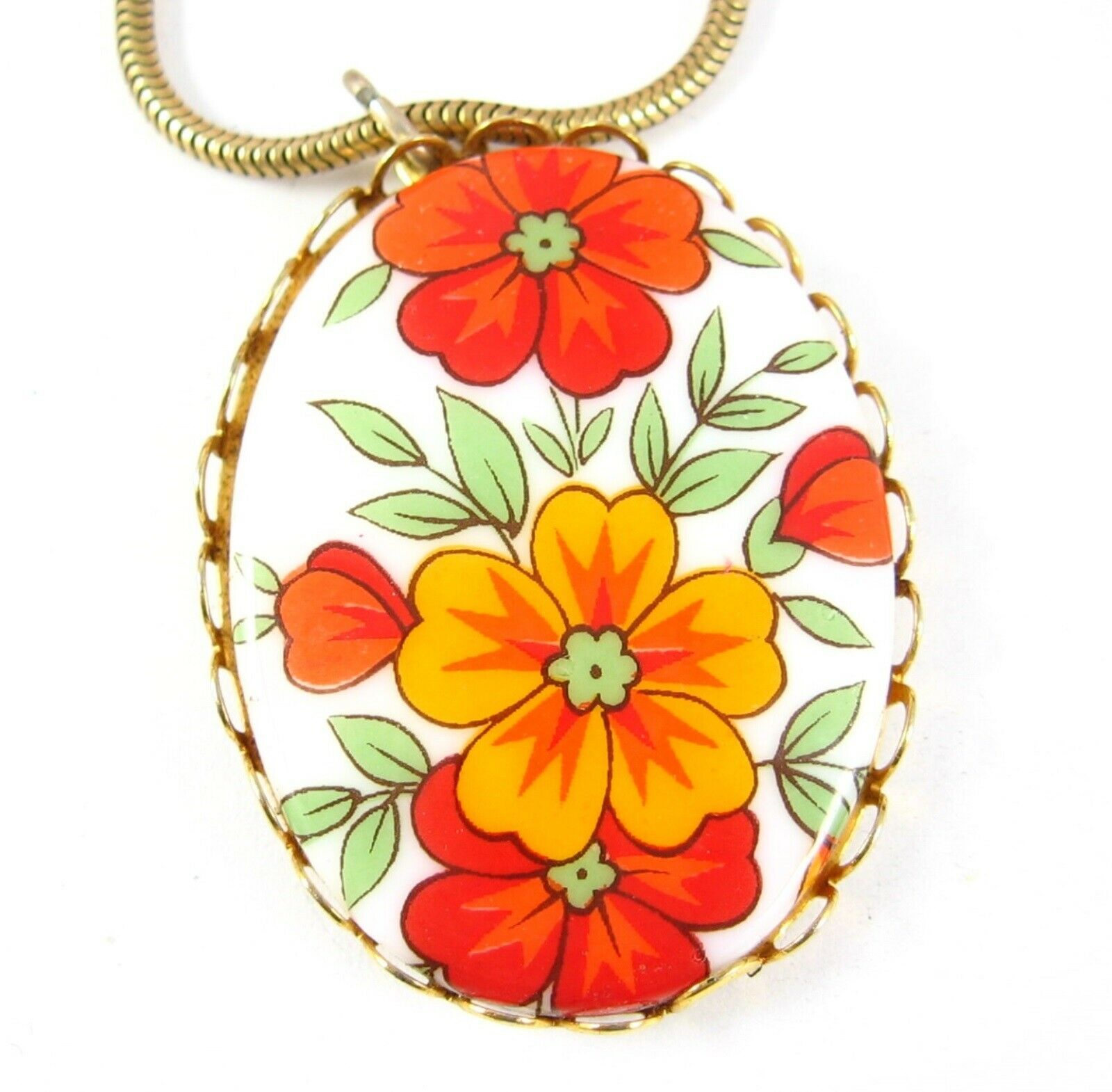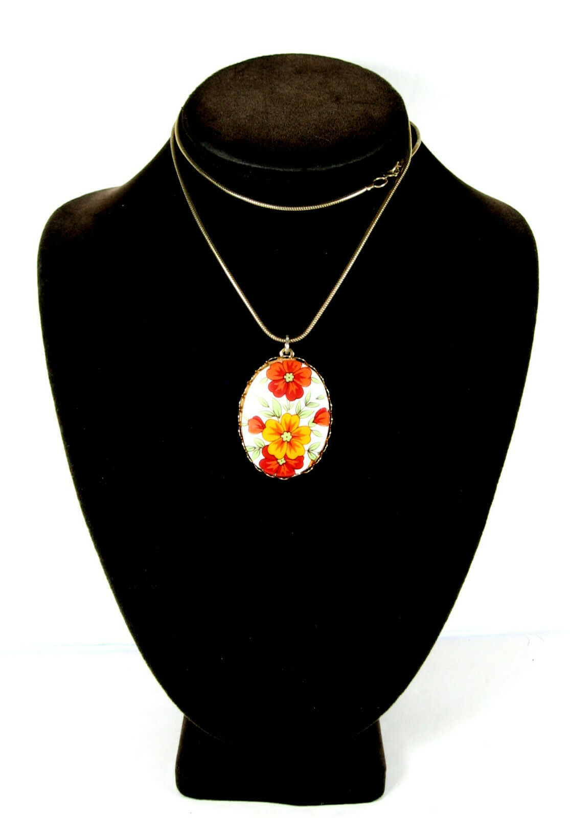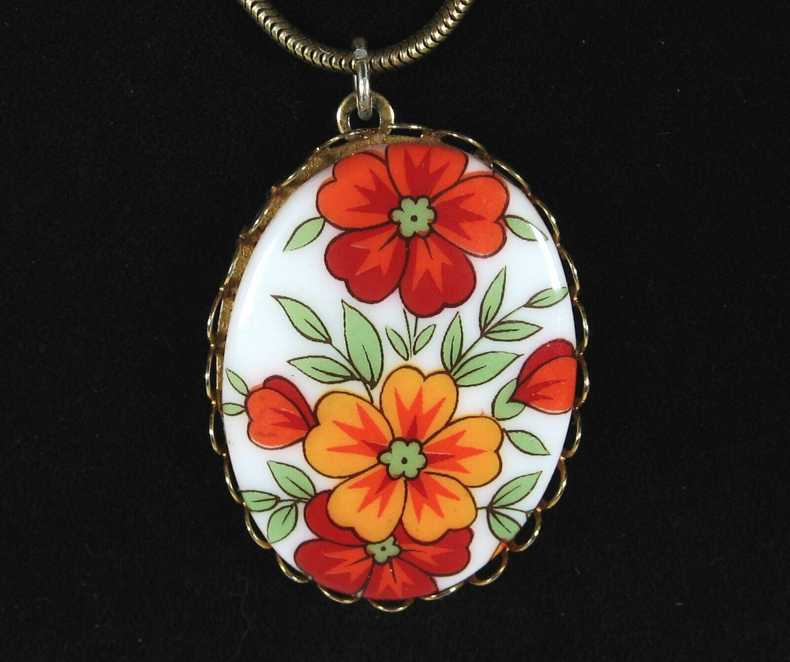 In a goldtone metal, this vintage necklace has an oval pendant that is either glass or porcelain. Against a white background there are flowers that are done in bright orange, red and a deep yellow with green leaves!