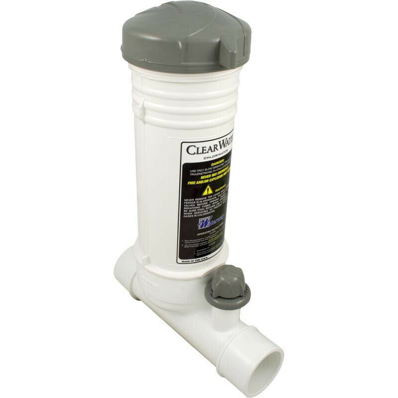 The Waterway CLC012-W Automatic In-Line Chlorinator for In-Ground Pools provide safe and reliable swimming pool sanitation. The ClearWater Chemical Feeder has an improved durable flow valve for regulating chlorine or bromine flow allowing adjustments for more accurate settings. The dial has been moved making it easier to view and the external hose has been eliminated from the in-line model. The check valve prevents backflow of water into the chlorinator. This unit holds up to twelve 3" chlorine tablets at one time.