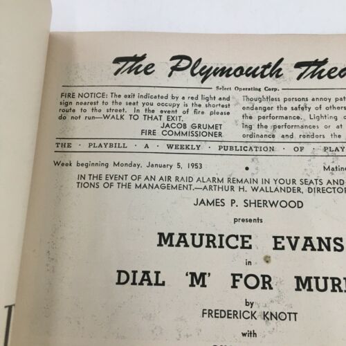 1953 Playbill The Plymouth Theatre Presents Maurice Evans in Dial M For Murder