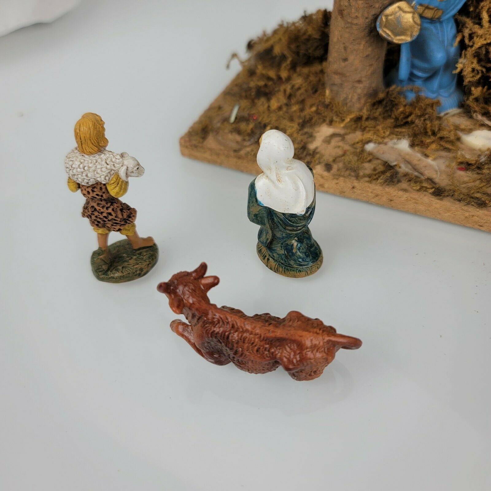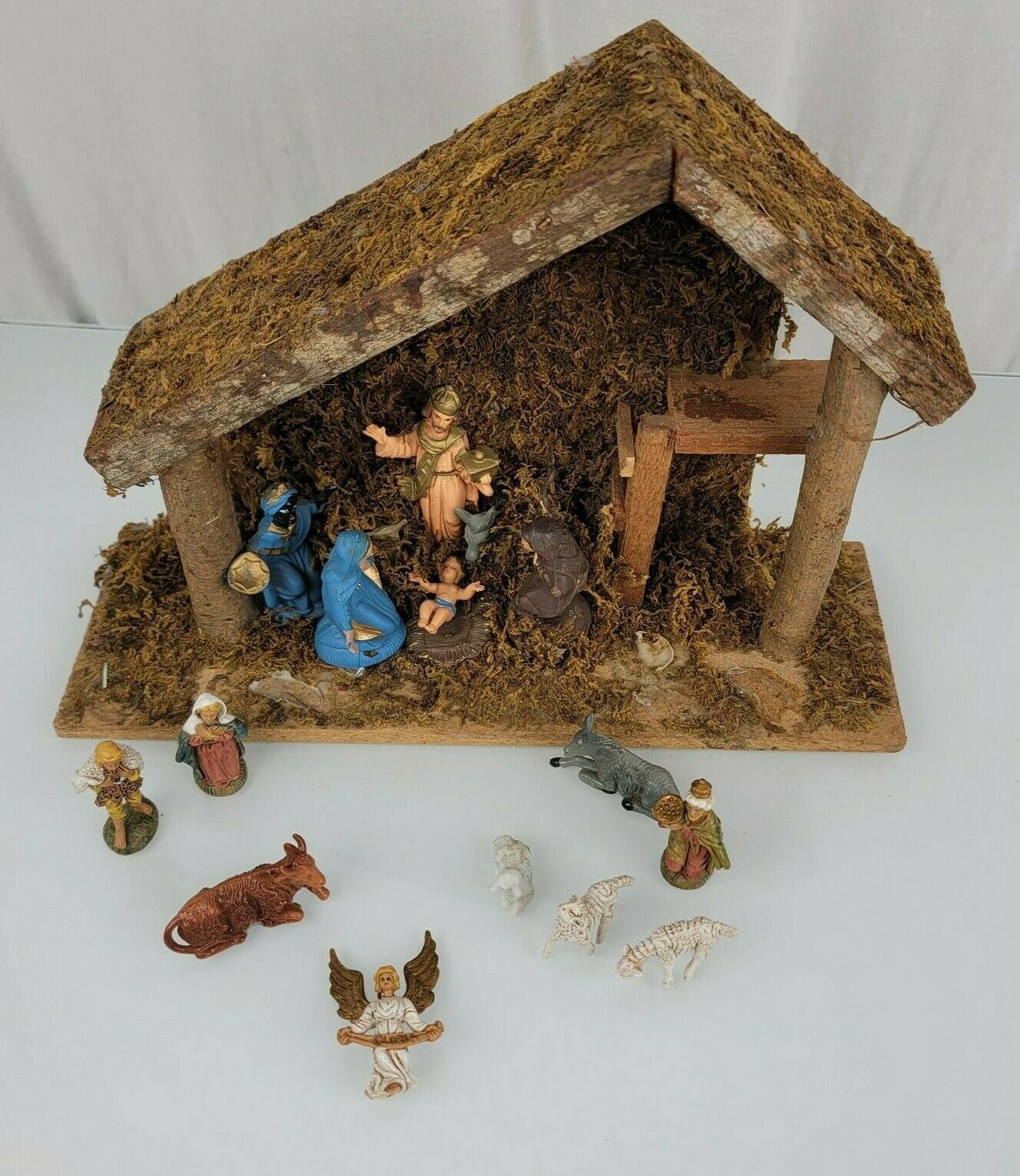 16 plastic pieces and 1 wood creche. Made in Taiwan. Used, From a clean, non-smoking and pet-free home.