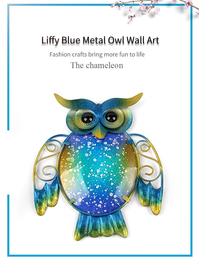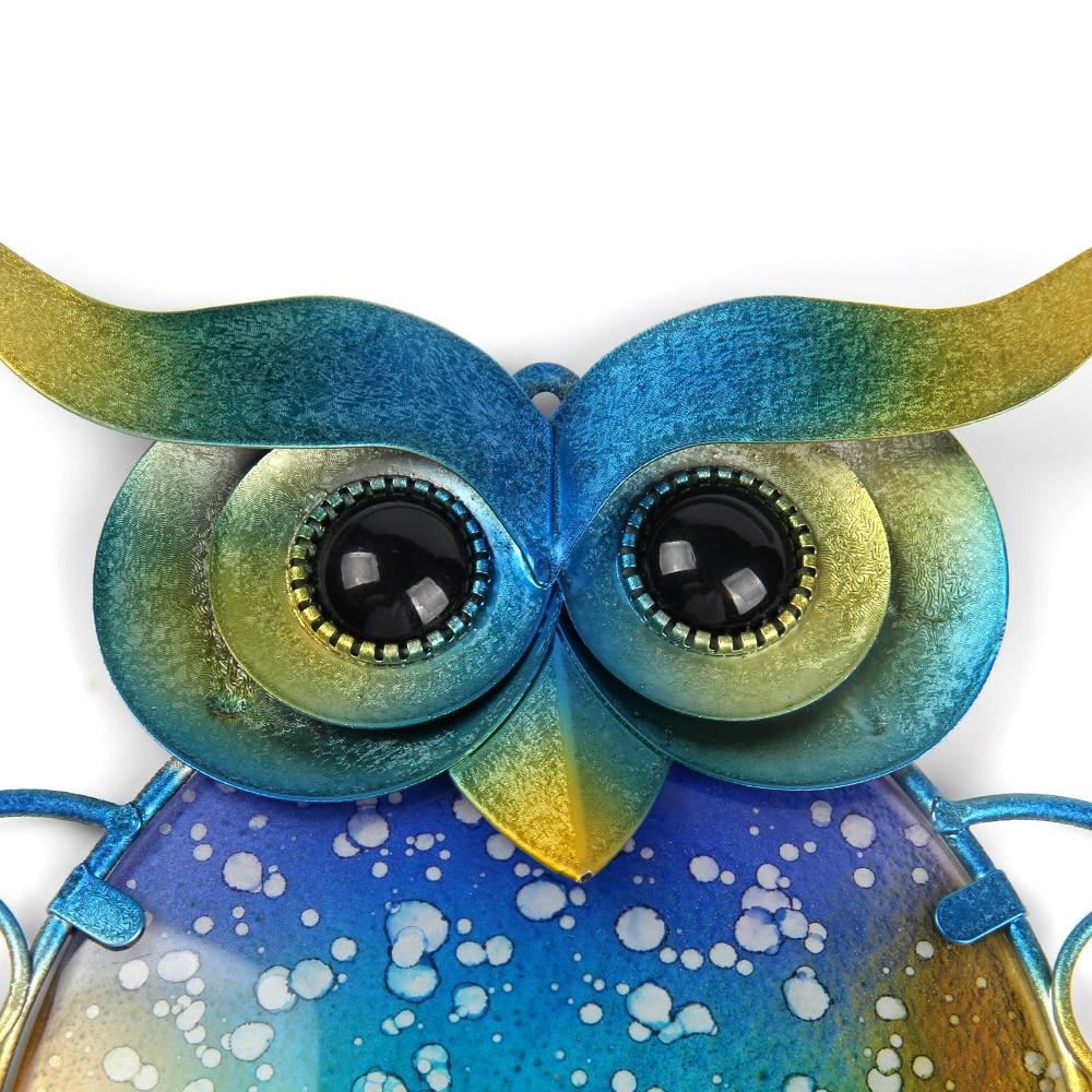 Handmade Garden Metal Owl Wall Artwork with Blue Painting Glass for Garden Decor