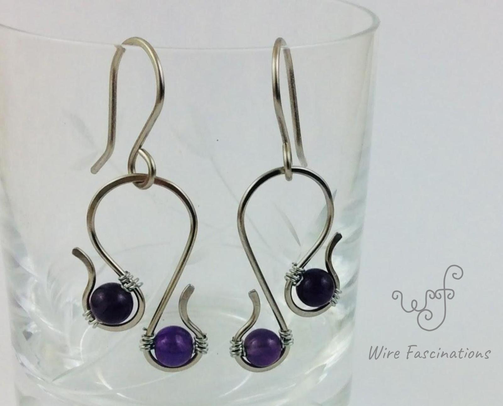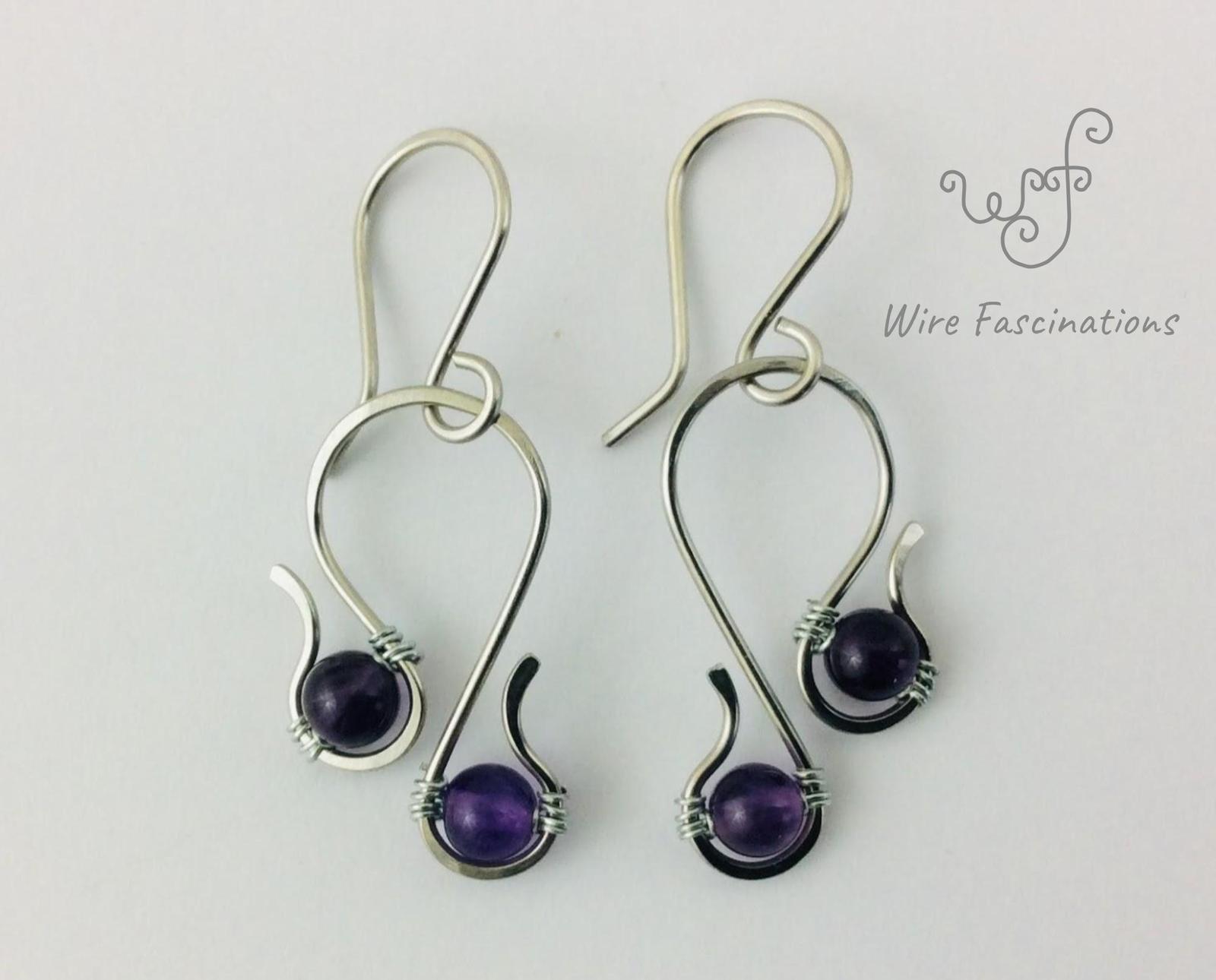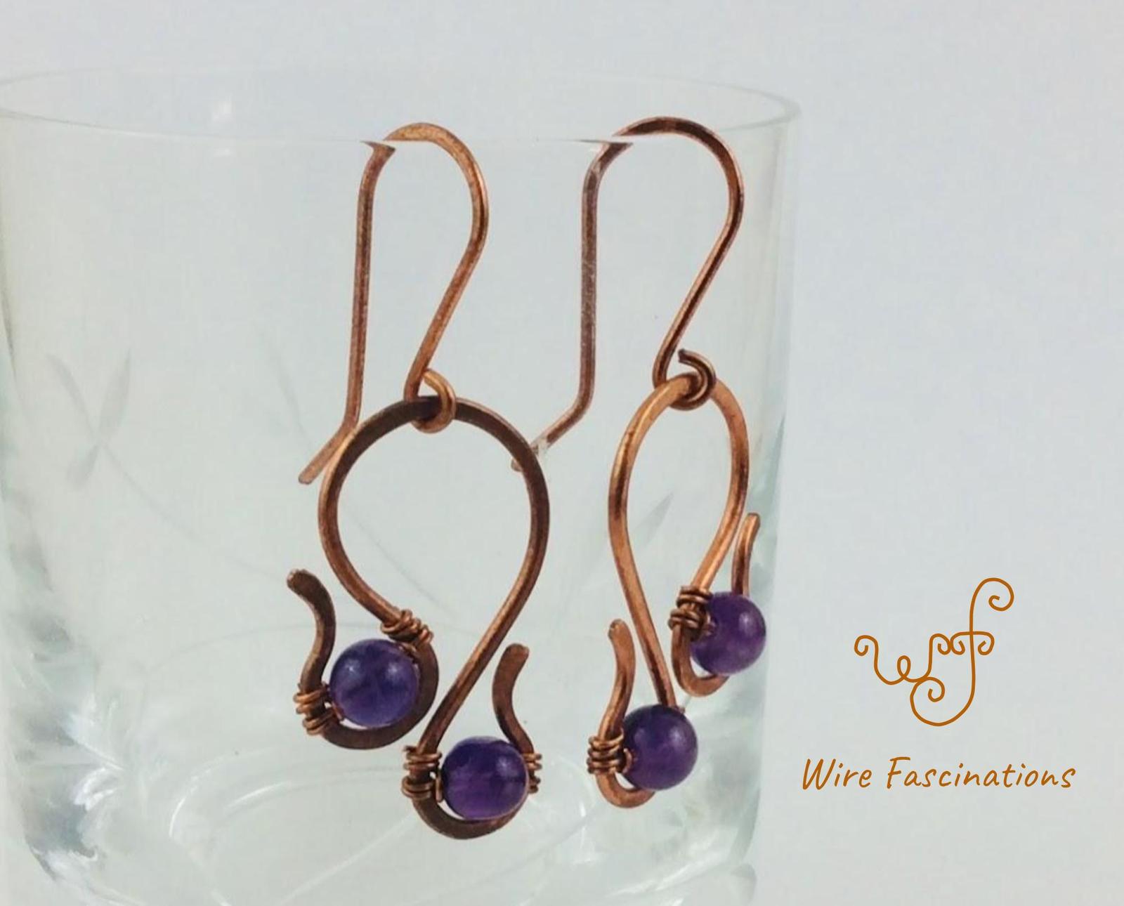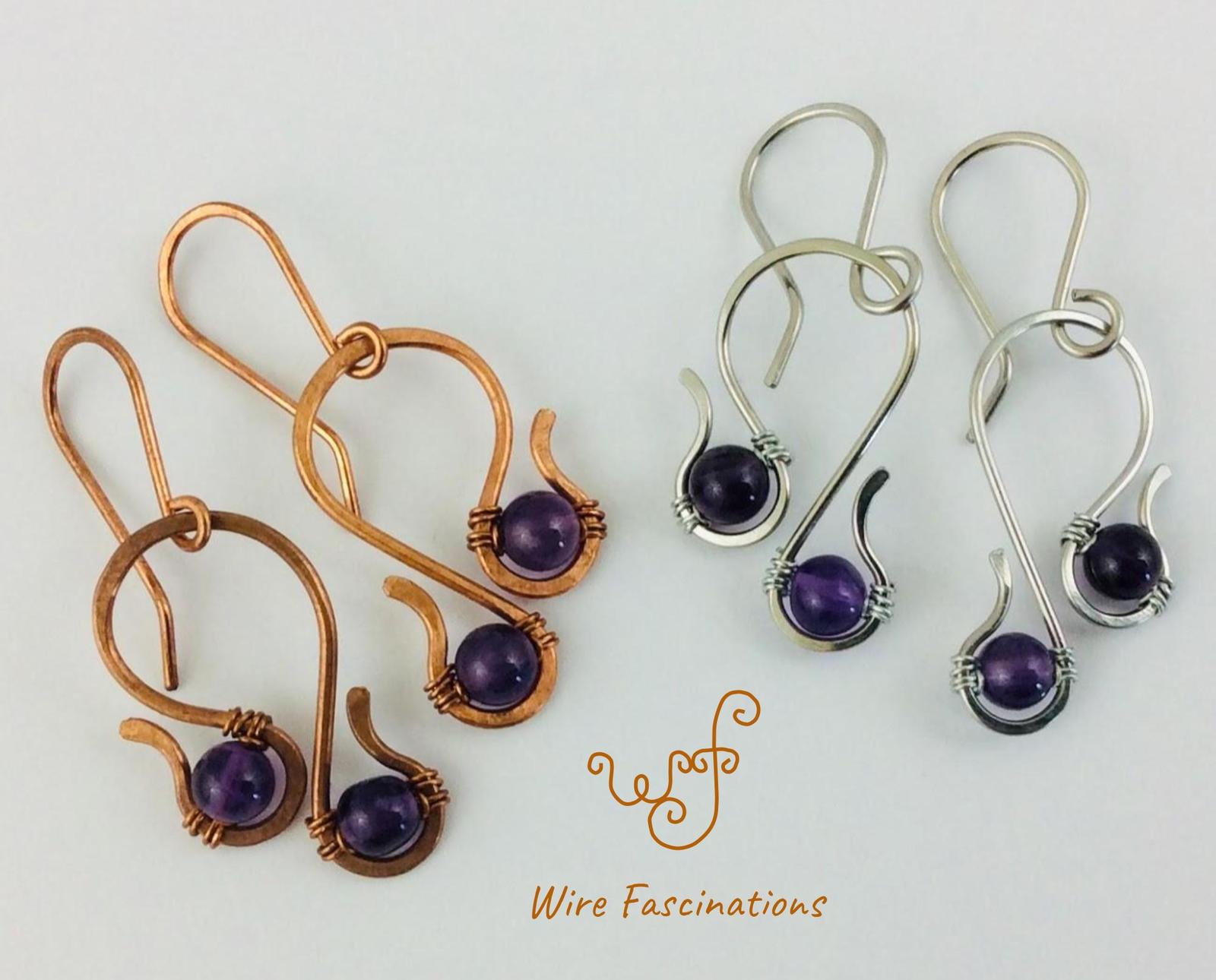 Handmade wire wrapped earrings: small copper or stainless steel swirls amethyst