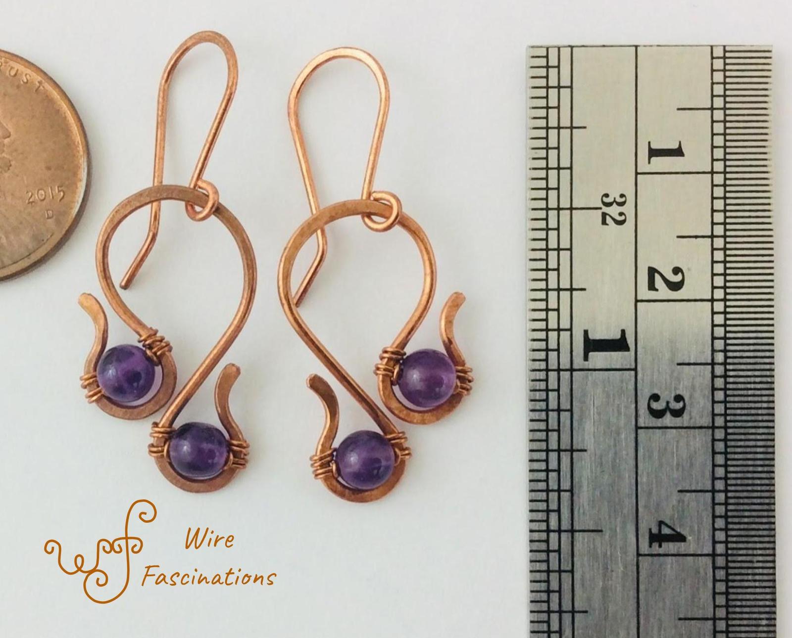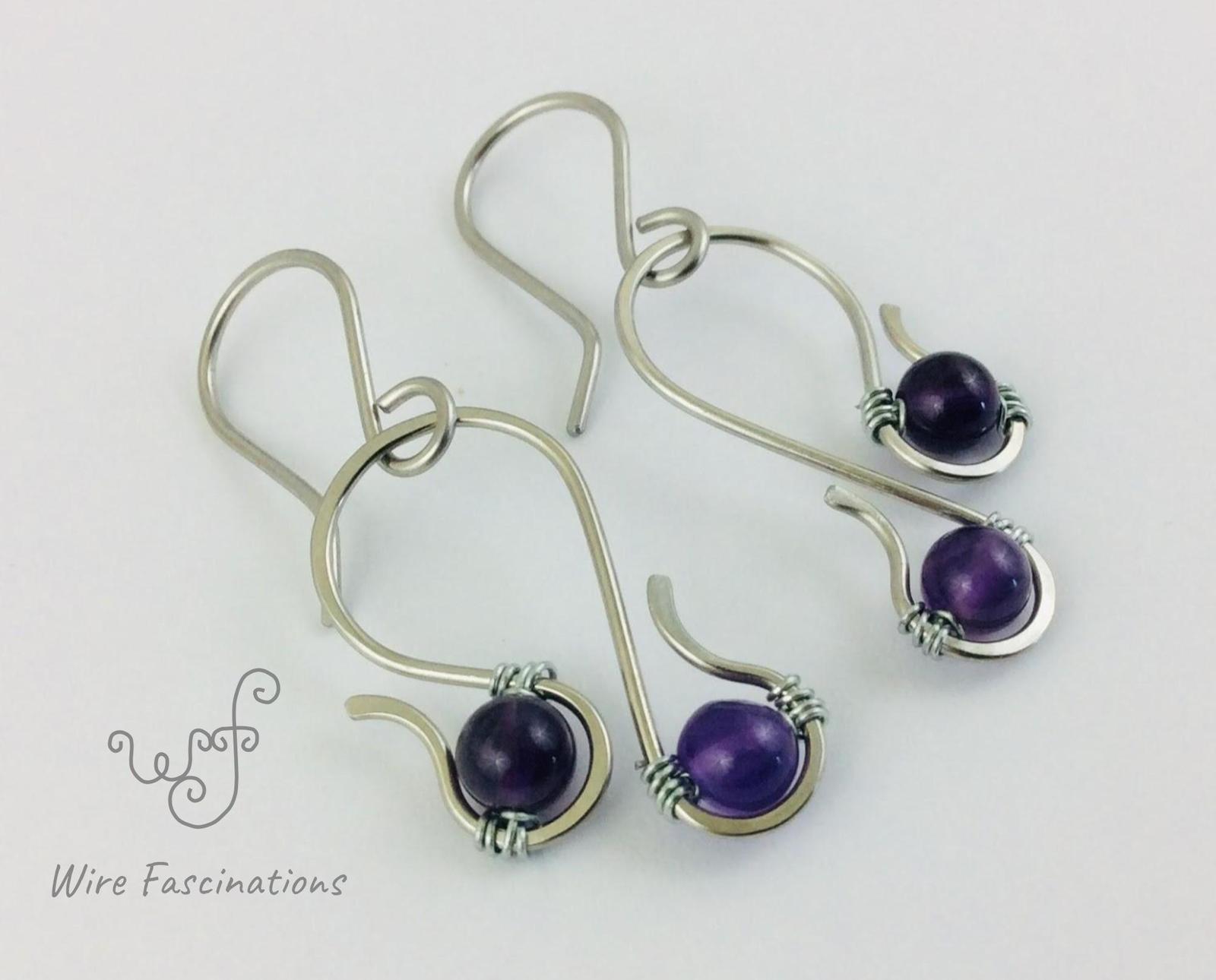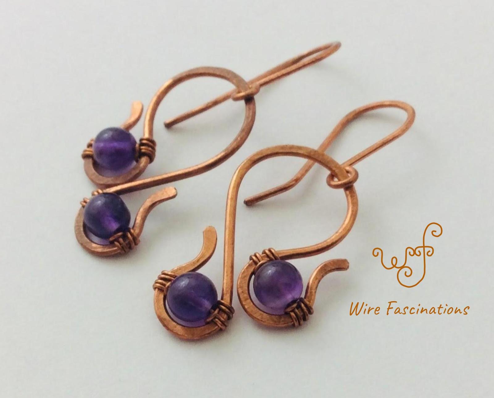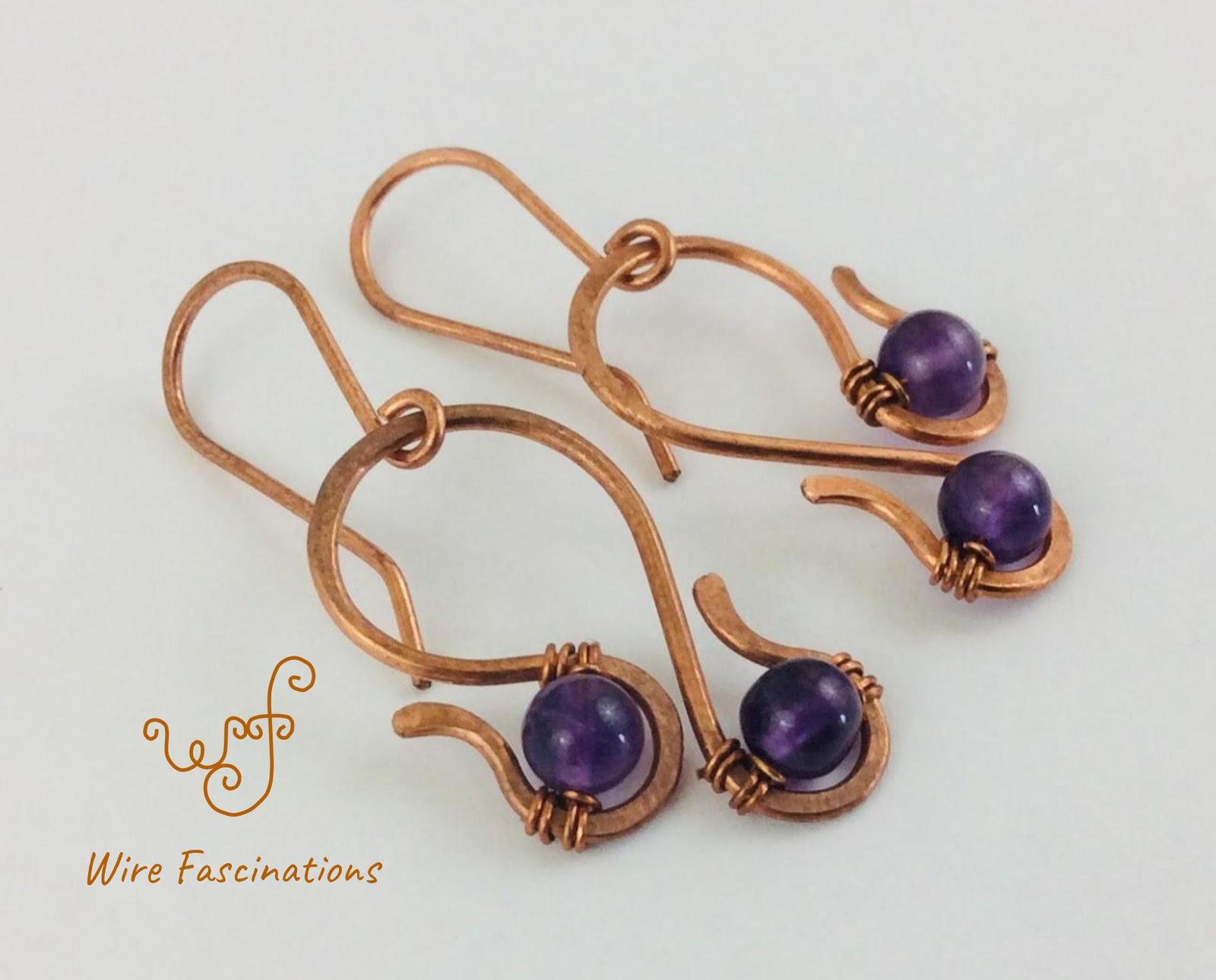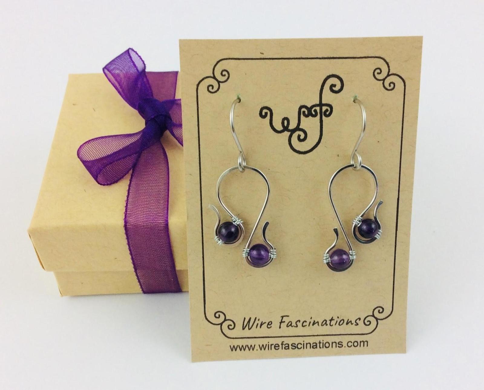 Handmade wire wrapped earrings: small copper or stainless steel swirls amethyst
