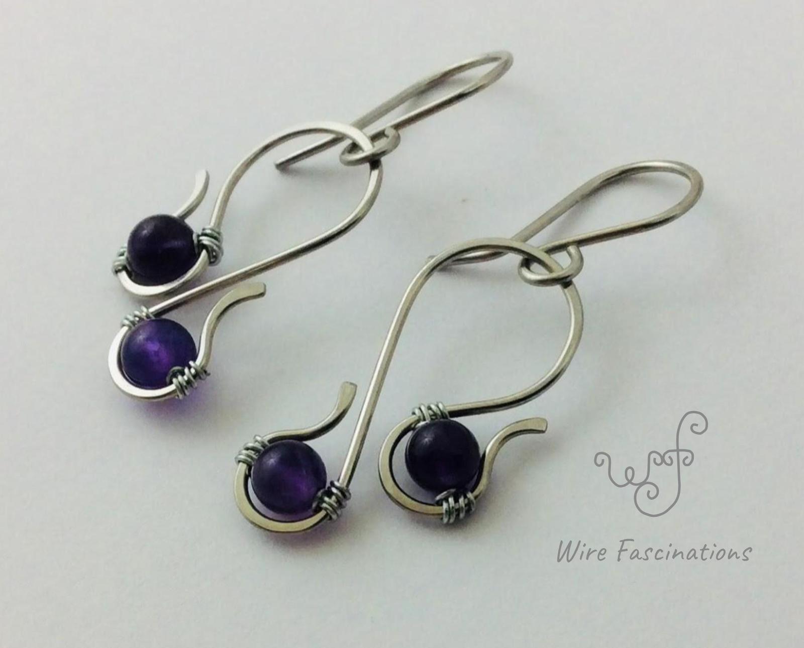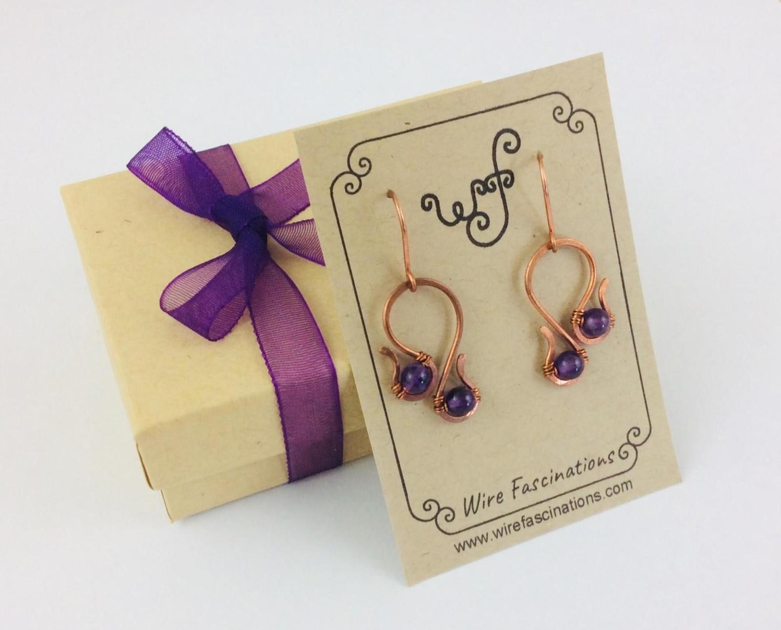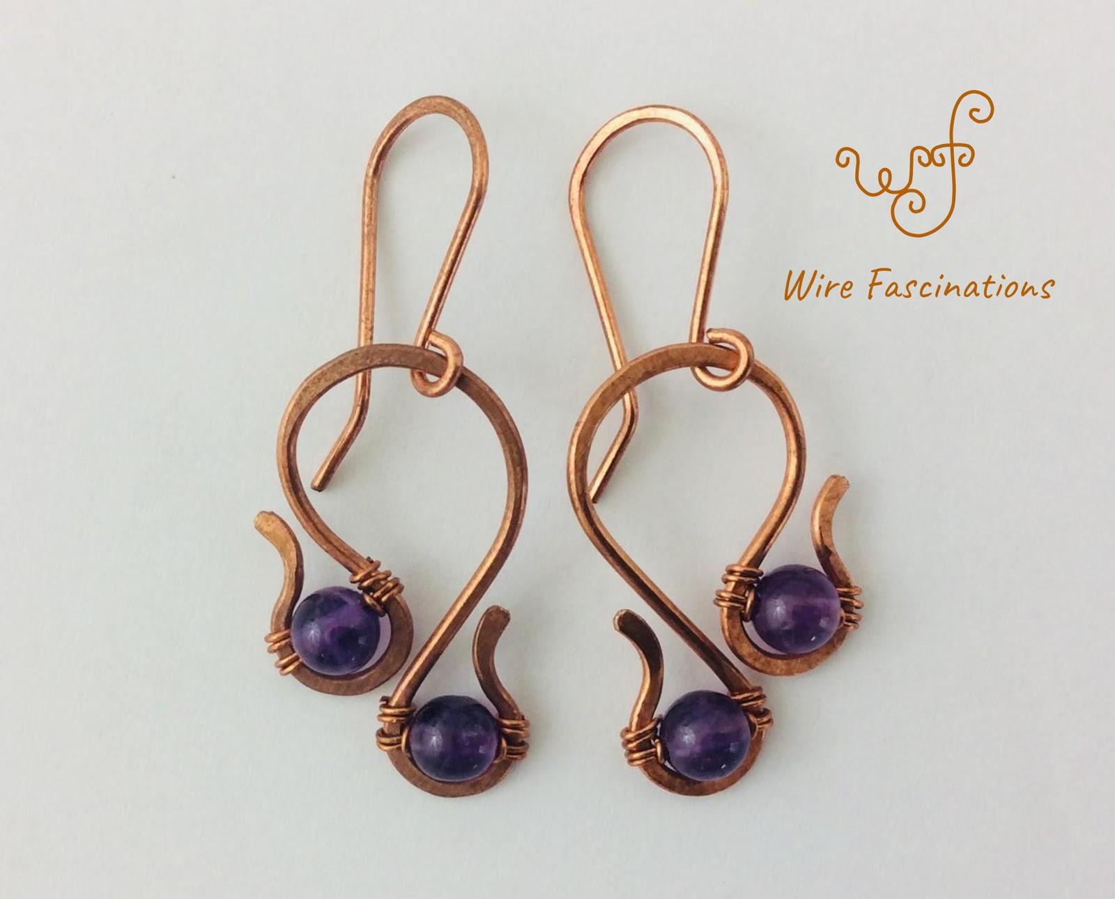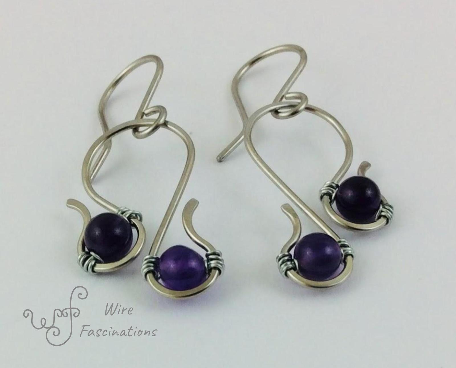 Handmade wire wrapped earrings: small copper or stainless steel swirls amethyst