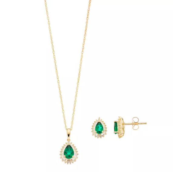 14k Gold Over Silver Lab-Created Emerald Lab-Created White Sapphire Teardrop Pendant Earring Set - brand new in box