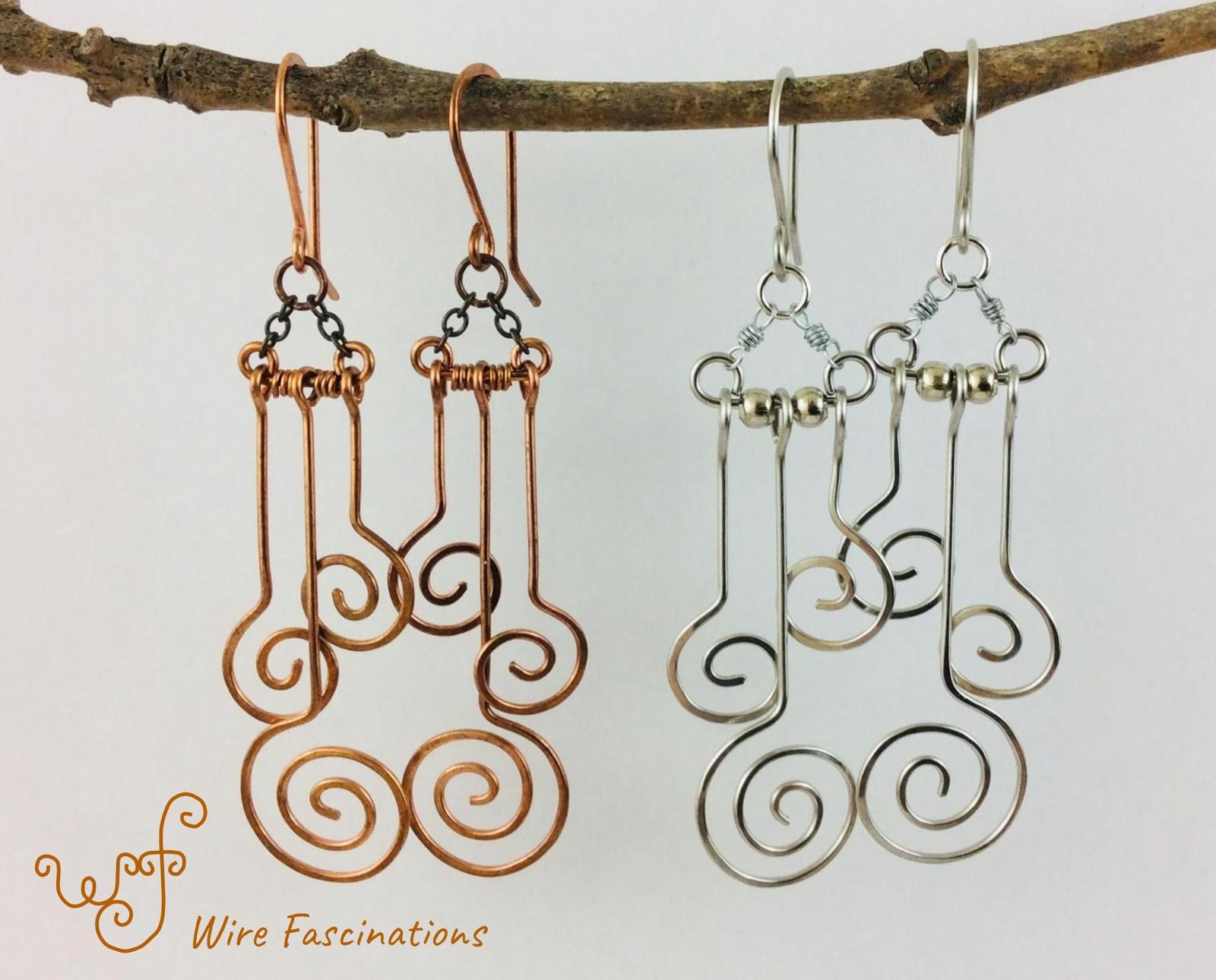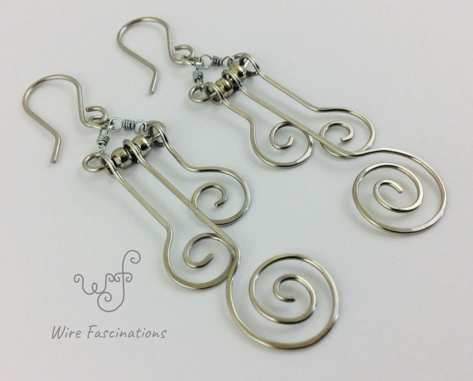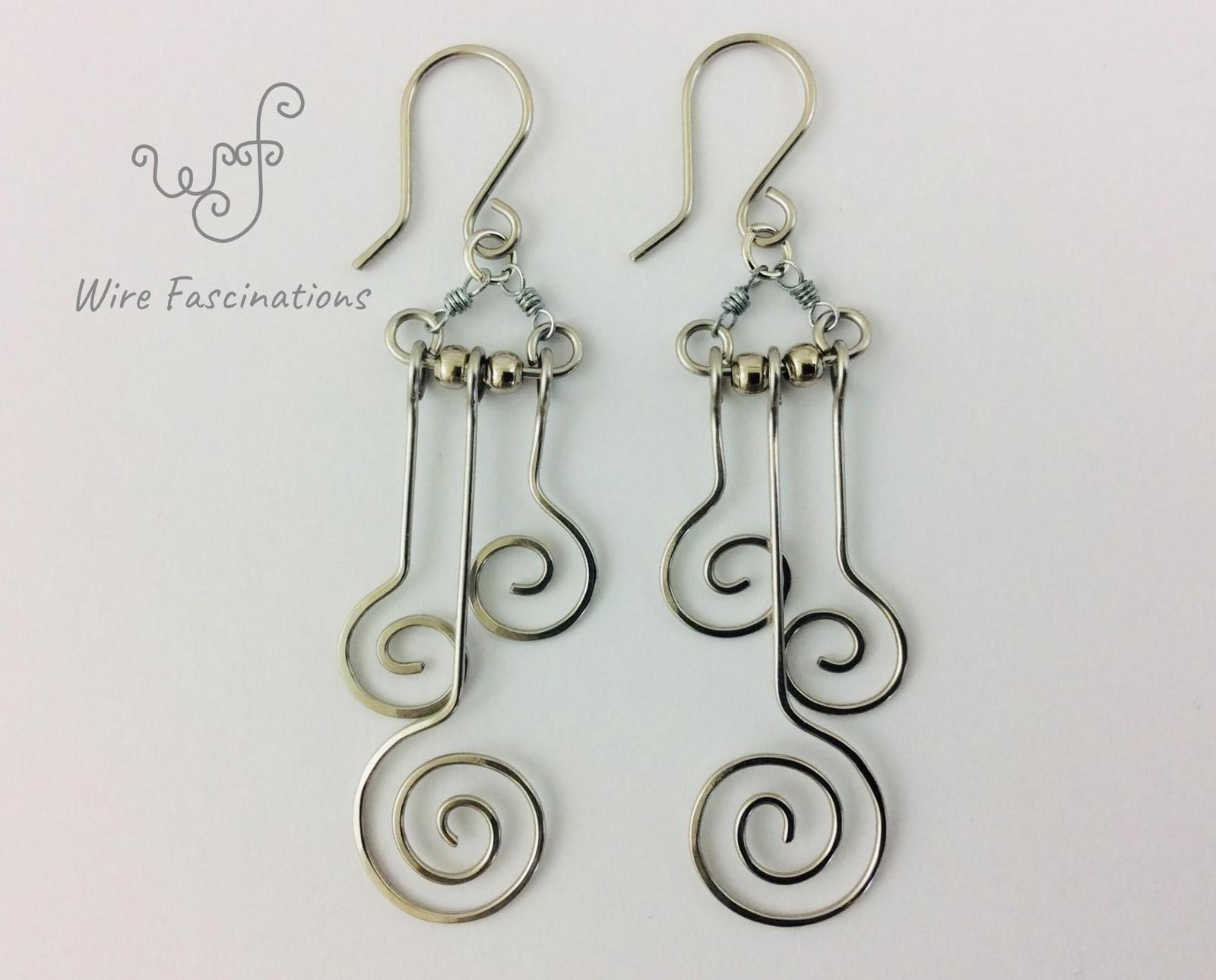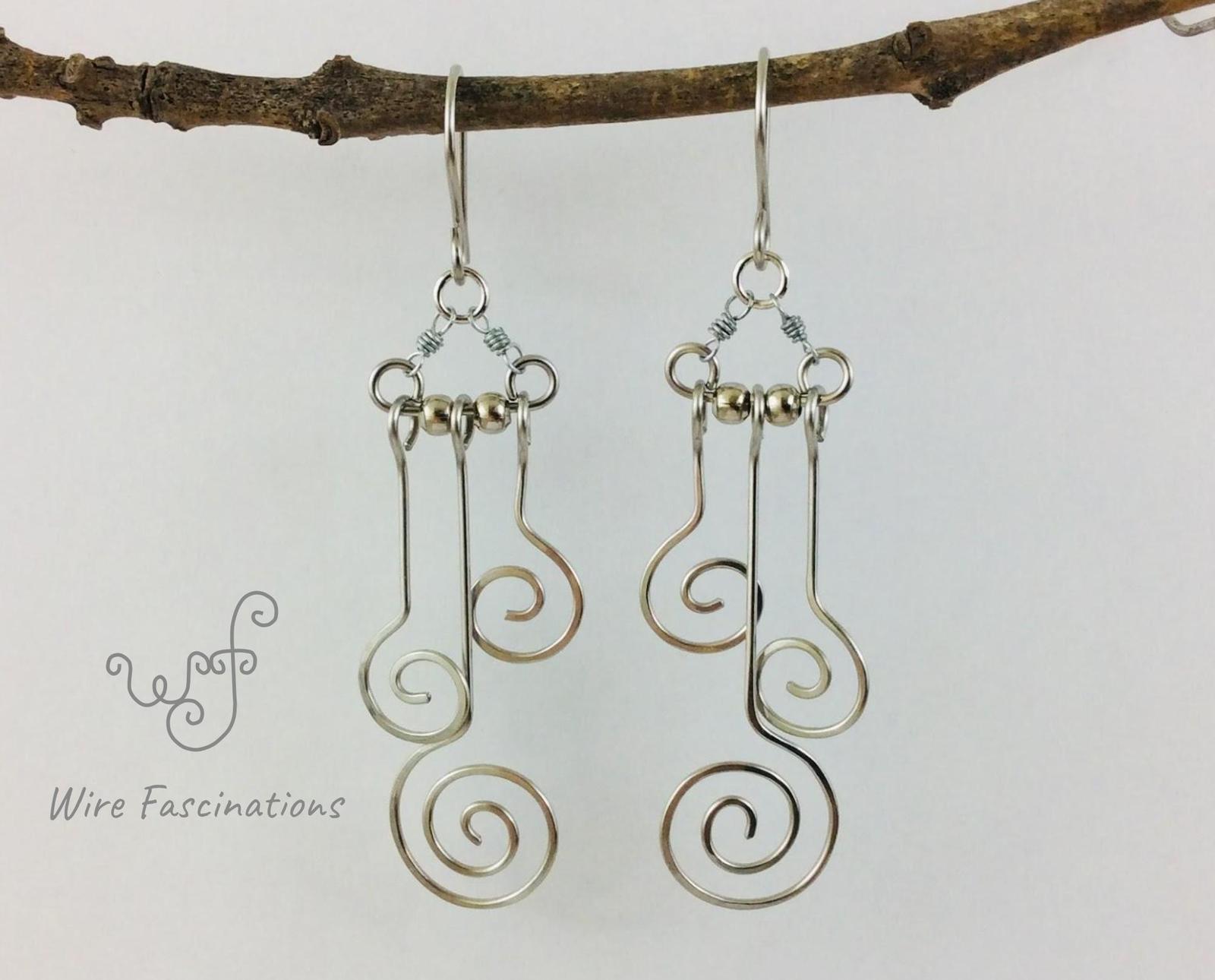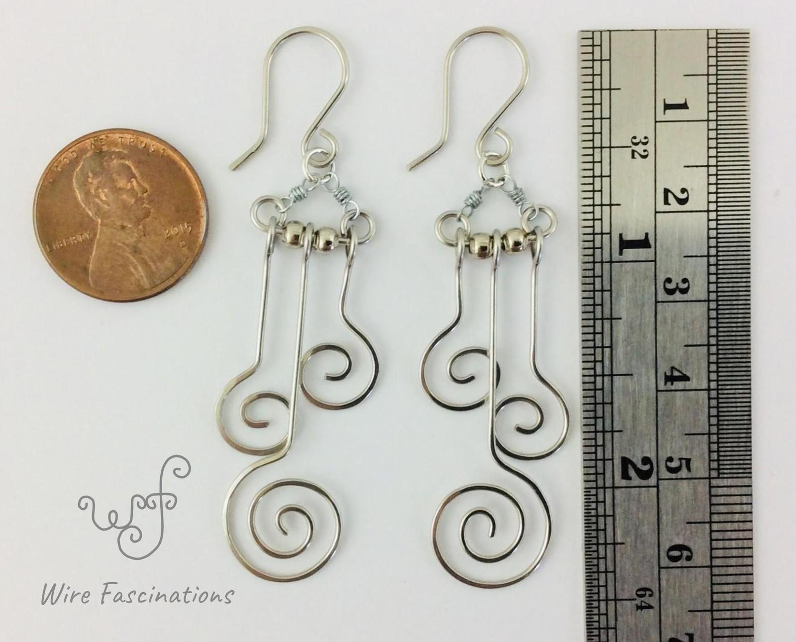 These handmade earrings are chandelier style with three long hammered spiral dangles hanging from a suspended crossbeam.