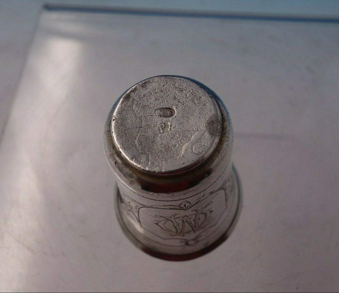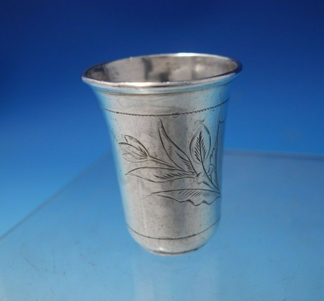 Remarkable Russian .875 silver shot glass marked #84 featuring bright-cut flowers (maker unknown/mark is worn). This piece measures 2" tall x 1 5/8" and weighs 0.7 troy ounces. It is monogrammed (see photos) and is in good vintage condition. Wonderful!