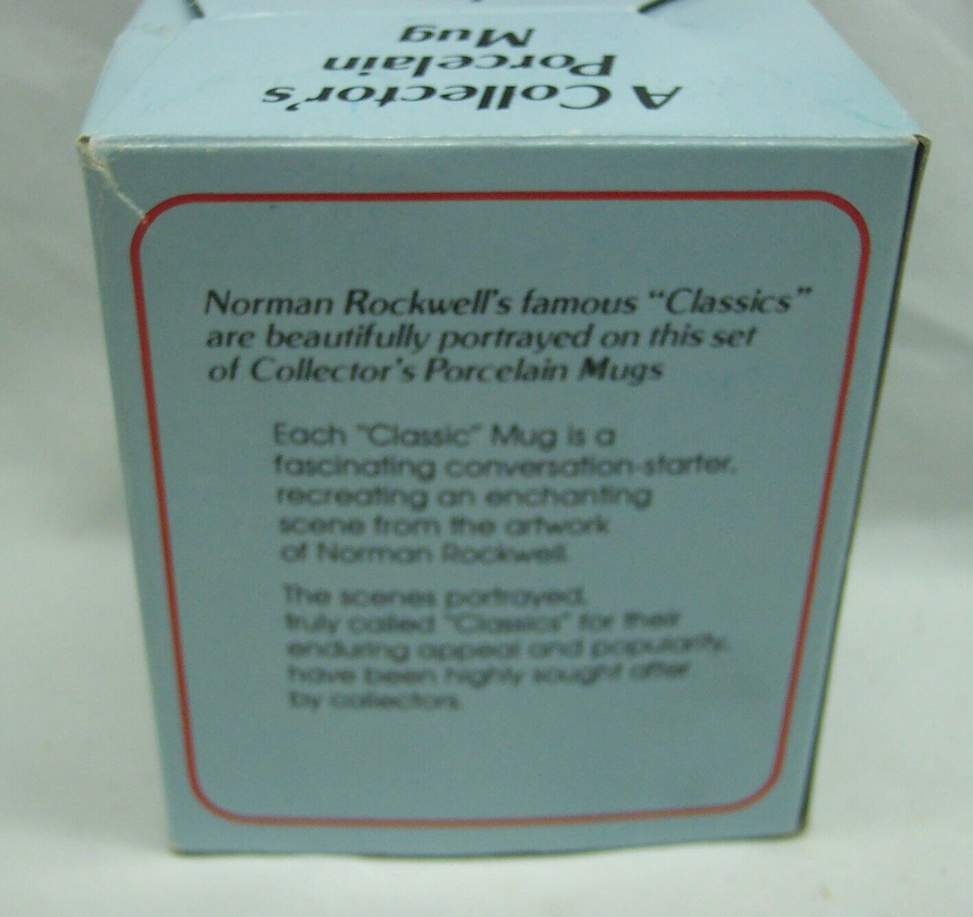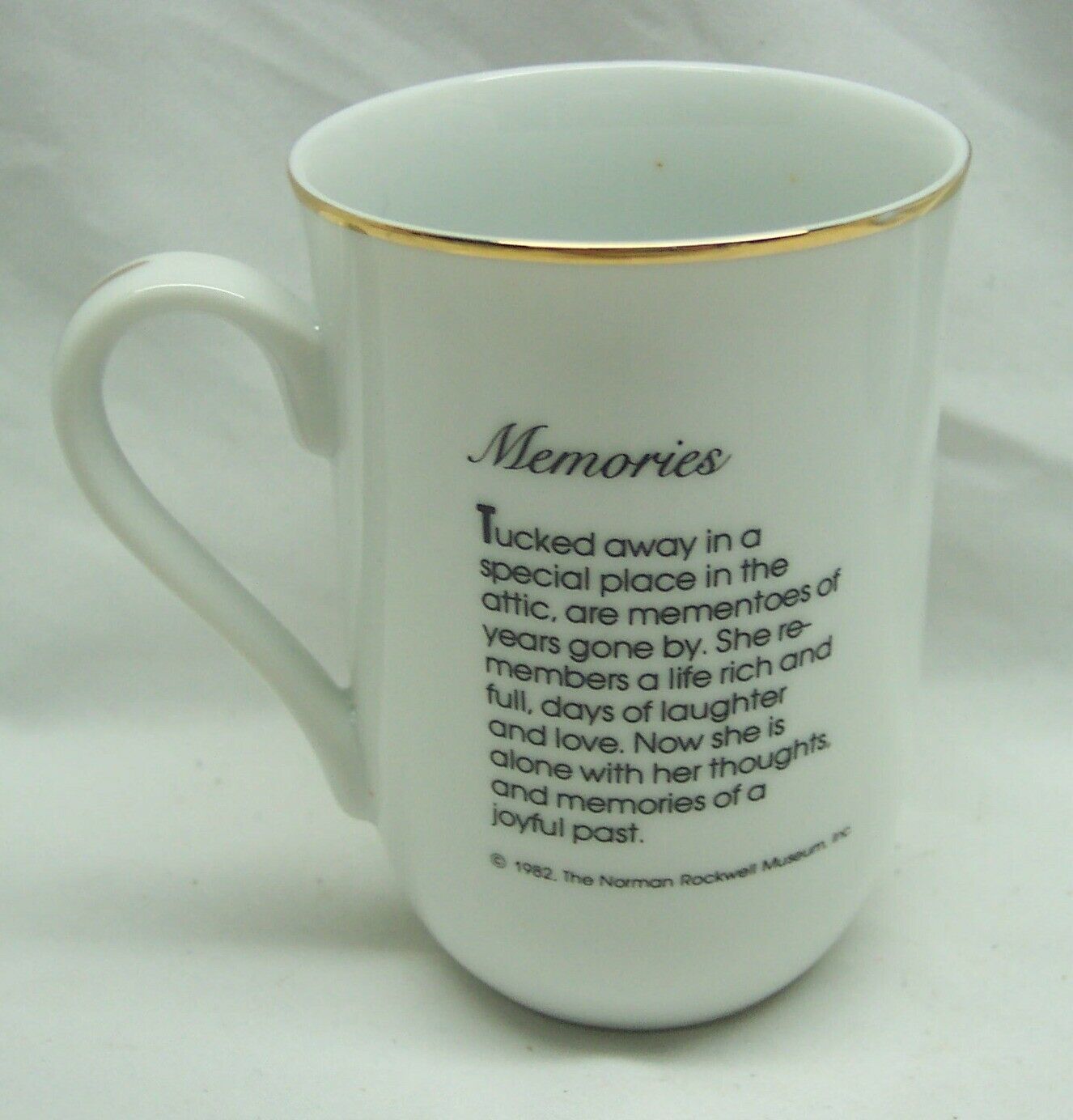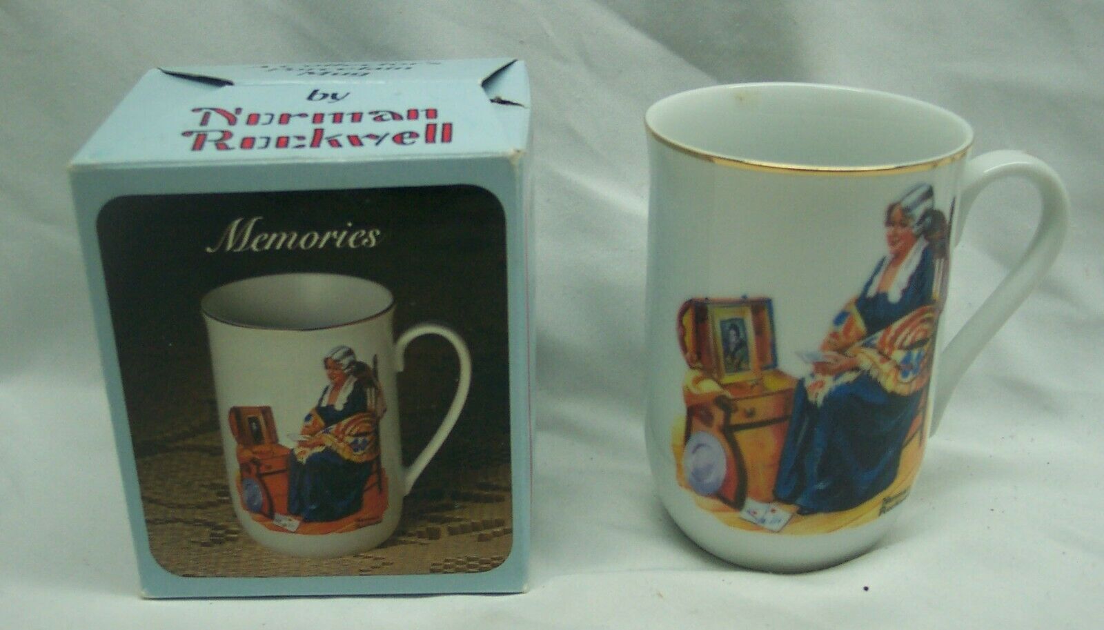 This is a VINTAGE Norman Rockwell Museum Memories 4" Porcelain CUP from 1982. It is 4 inches tall ( 2 1/2" Diameter). It is in NEW in the box. From Norman Rockwell's Artwork Classics Collection. Scene Portrays "Tucked Away in a special place in the attic, are mementos of years gone by. She remembers a life rich and full, days of Laughter and Love. Now she is alone with her thoughts and Memories of A joyful past. Combine auctions to save on shipping. EAG