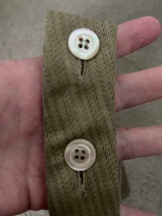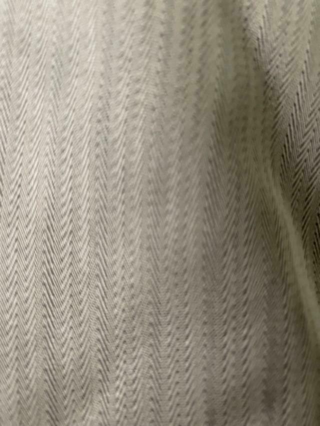 Has herringbone design and is a V-neck wrap front style with invisible zipper on the side. It is backless and has 2 different button positions at the neck.