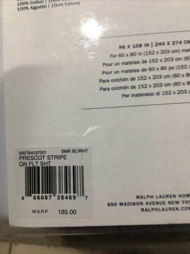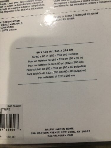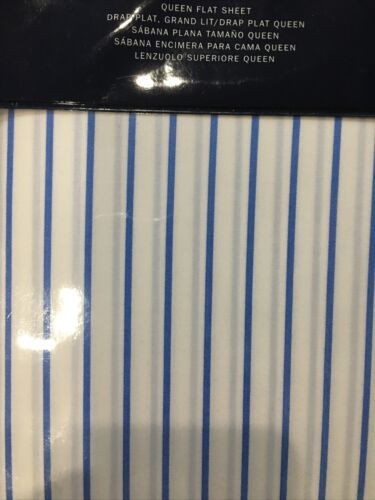 RALPH LAUREN PRESCOTT BLUE WHITE STRIPE 1pc QUEEN FLAT SHEET NIP $185