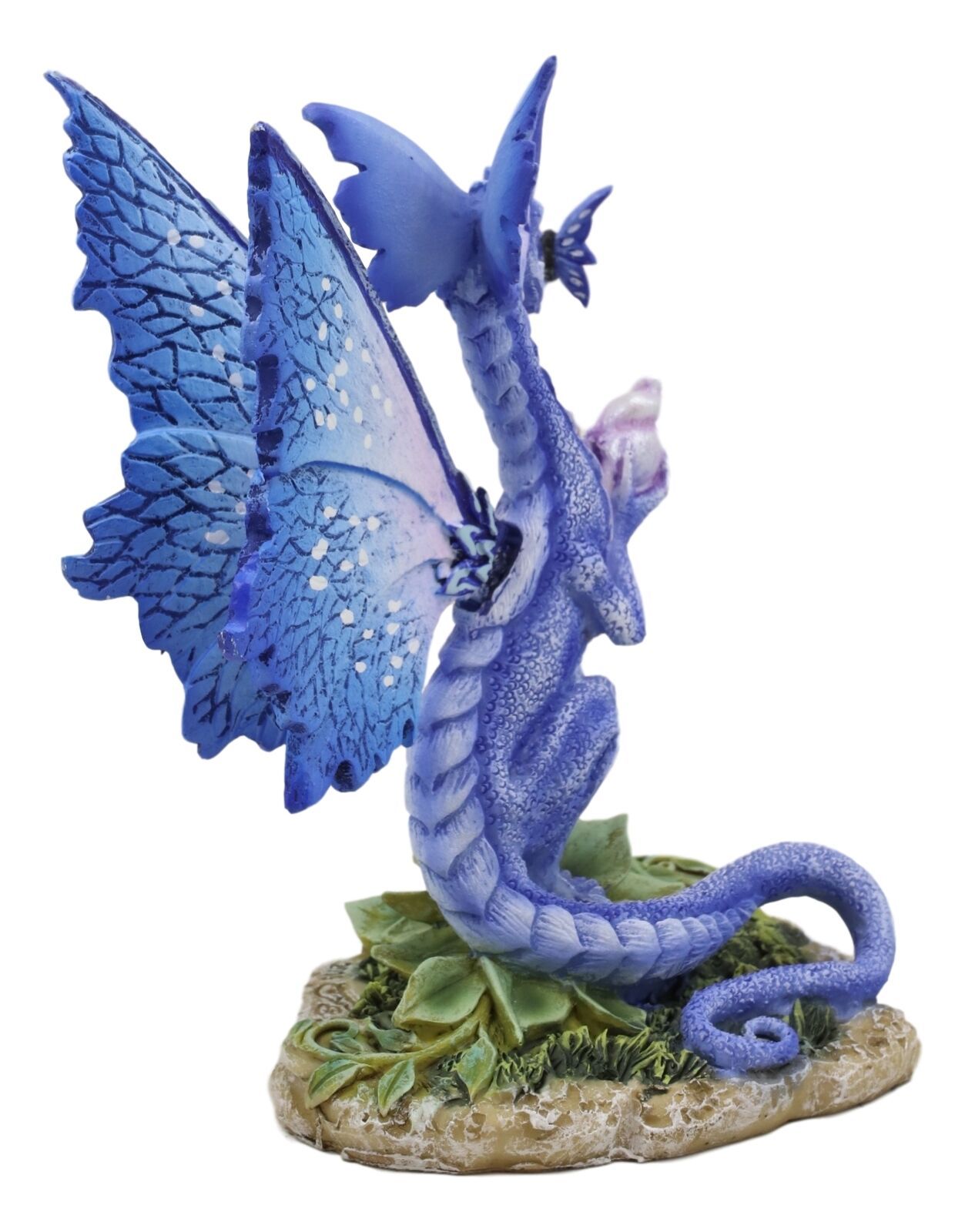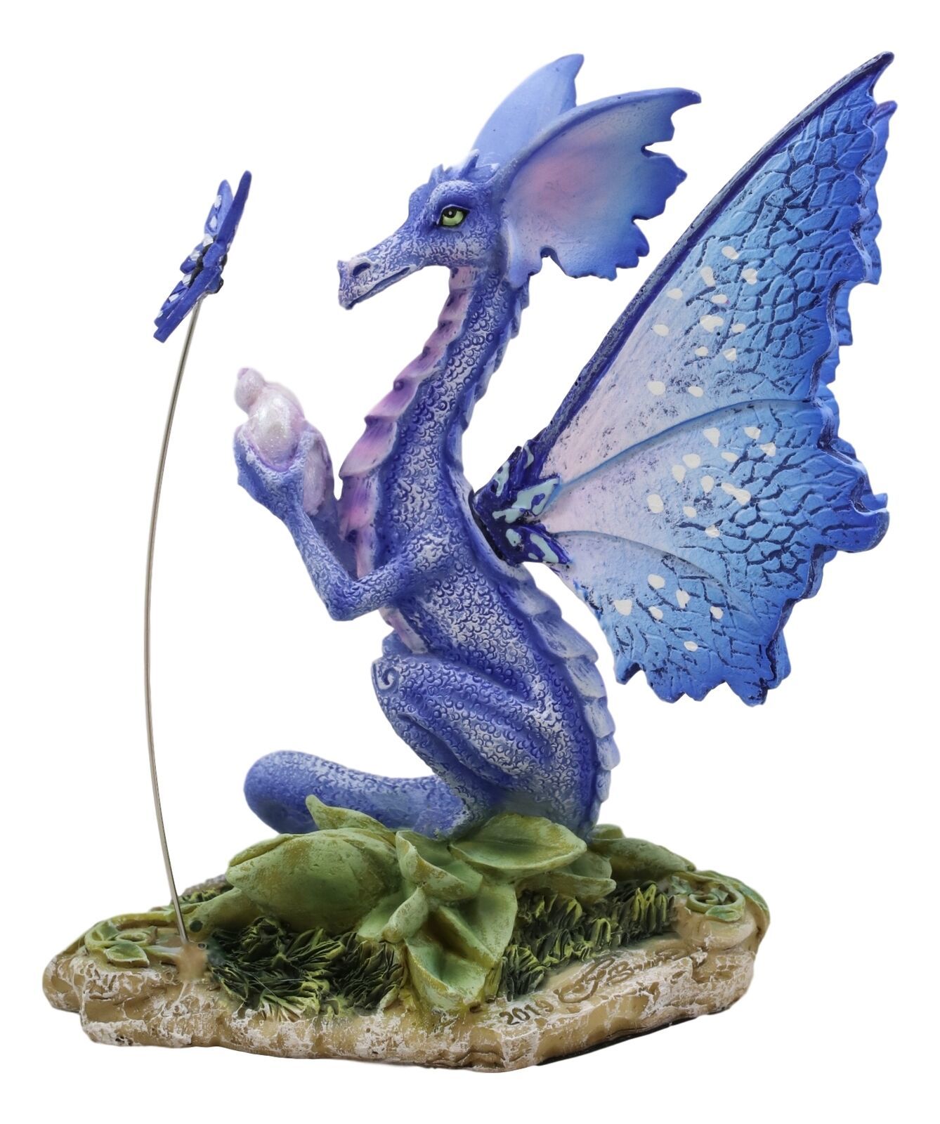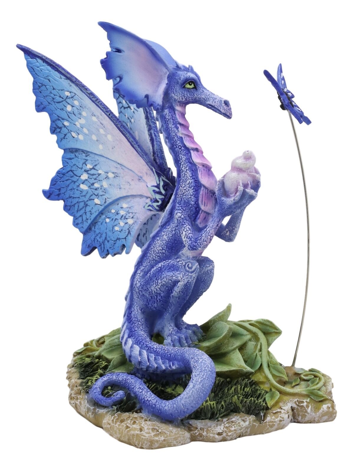 • Oh, the possibilities! This little colorful drake is contemplating what to do with his day. The dragon has blue scales with purple accents, and indigo fairy wings to match. He communes quietly with a butterfly while clutching a seashell. Unique and bright, this figurine by artist Amy Brown is sure to lift your spirits and add some magic to the home decor!