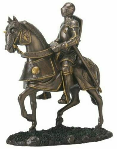 An English knight on Horseback is at attention in full armor in this statue miniature. With hand painted gold accents, it makes a great display piece for enthusiasts of medieval imagery.
