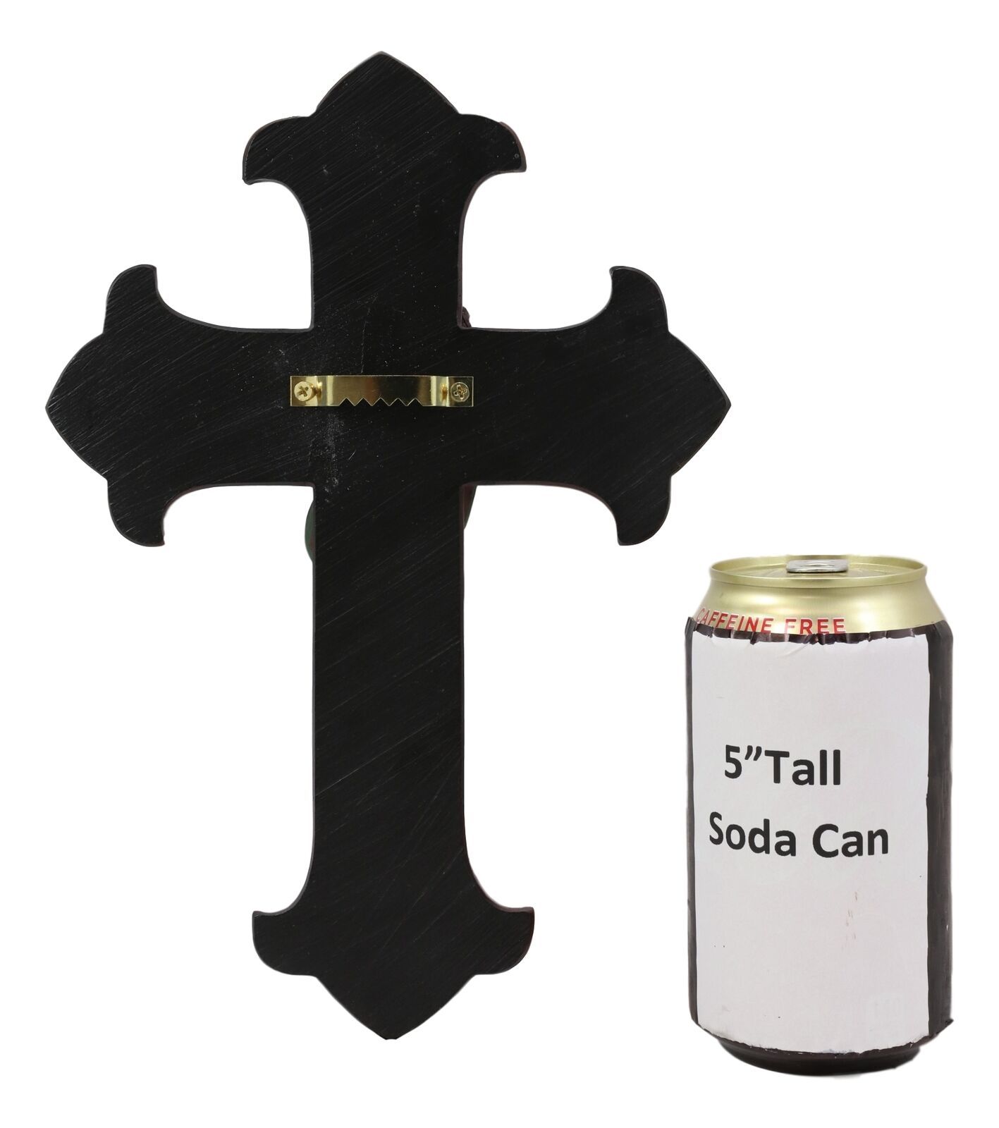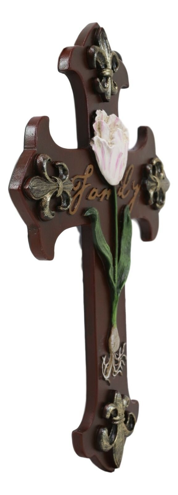 • This Western or Southwestern wall cross brings the elements of royalty in its Fleur De Lis symbol with beautiful blossoming pink rose of Sharon. The wall cross has the inscriptions Family in cursive writing. The ends of the cross are finished with the le fleur emblems, hand painted in aged bronze finish. The wall cross displays beautifully alone or with other wall sculptures.