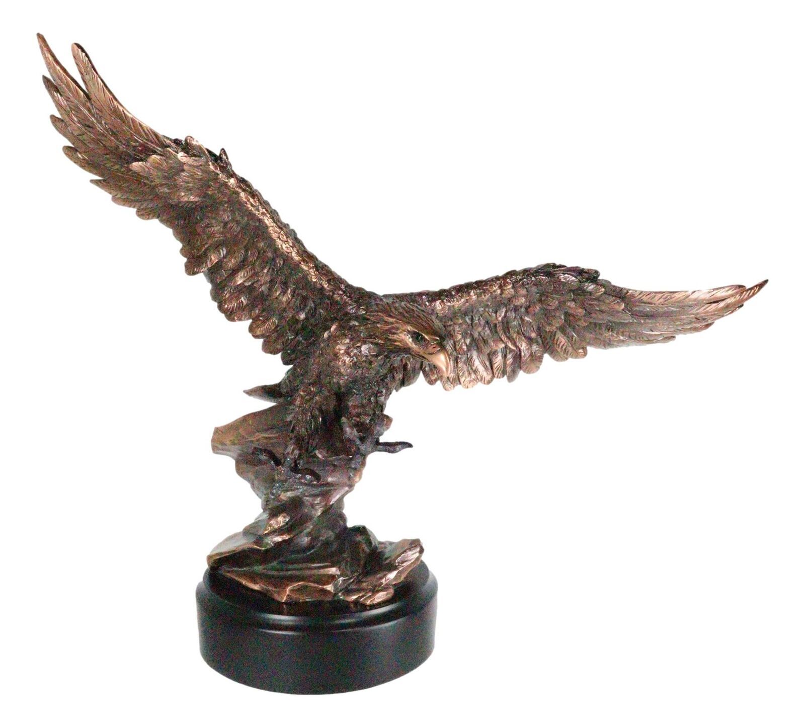 โข This Majestic Bald Eagle Figurine is made of the highest quality resin, undergoing the process of bronze electroplating giving it a uniform shine on the inside as well as the surface of the figurine. To add sculptural aesthetics and display worthiness, we add accent faux black wooden base to the sculpture.