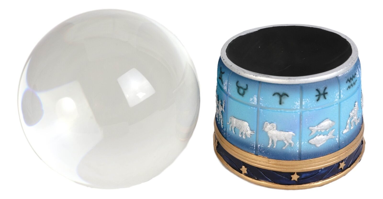 • Look into your psyche and you'll begin to find that astrology and zodiac characters mirrors how we interact with each other. This crystal clear gazing sphere ball comes with cold cast resin base. The rounded base features the 12 zodiac signs and symbols, embossed in silver paint individually. Splashed with multiple hues of light blue, gold and dark blue depict the vast sky at night. The clear ball sits on top of the base, and when removed, you can store small trinkets or crystals.