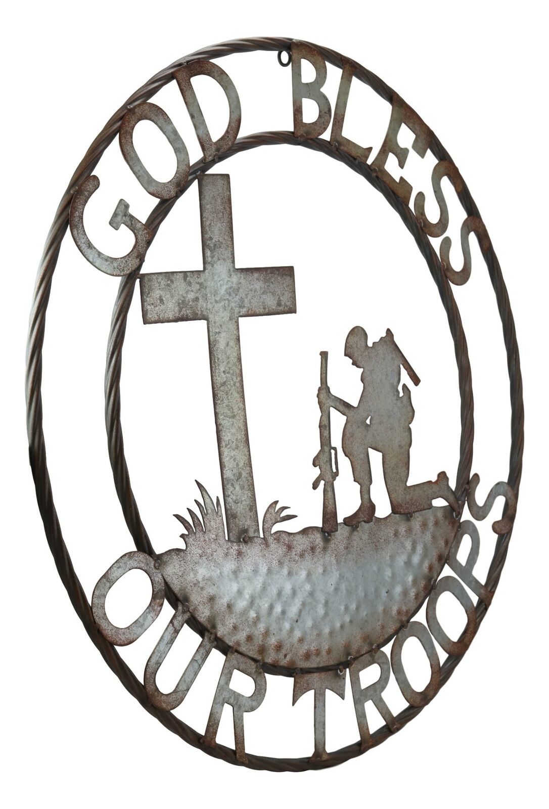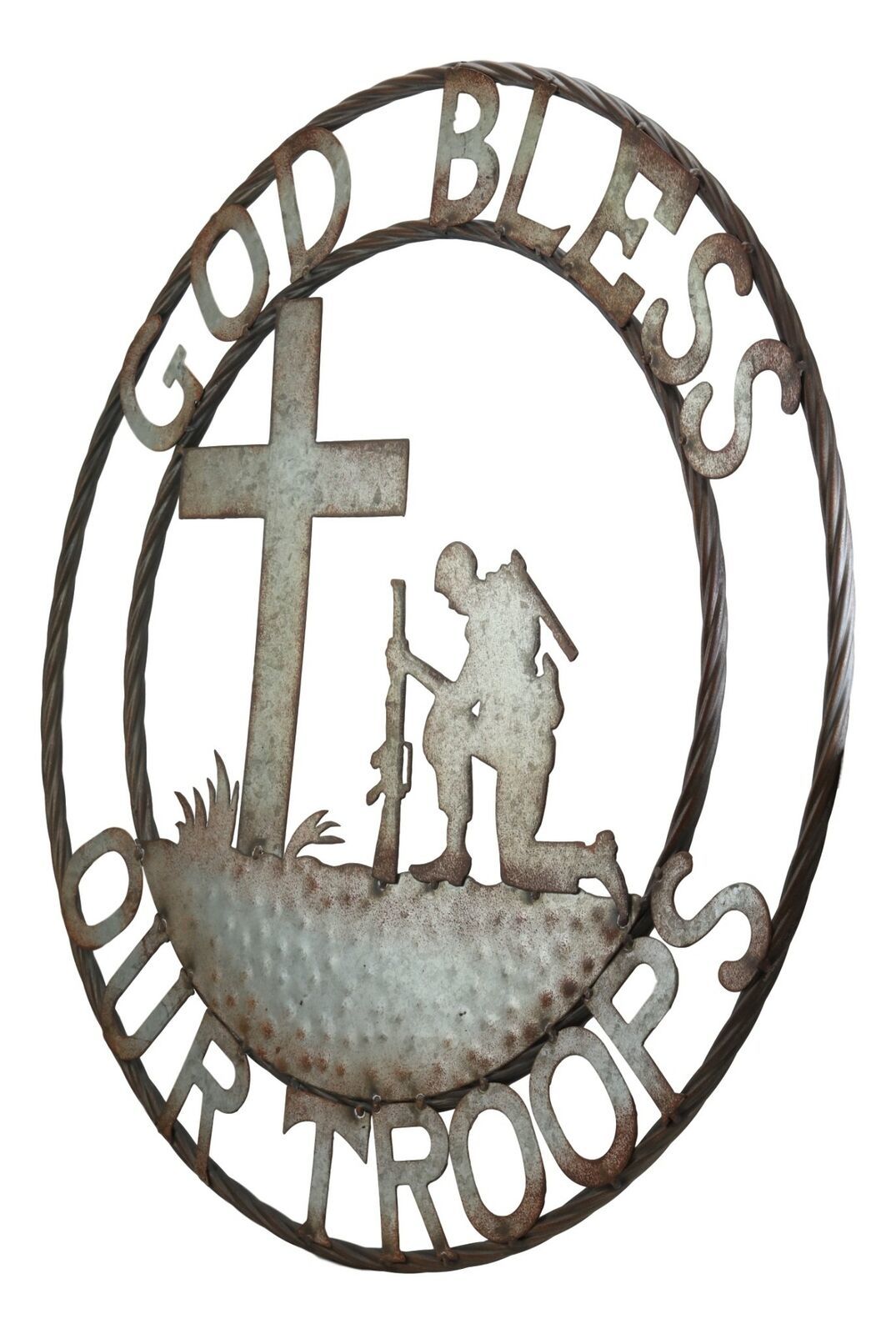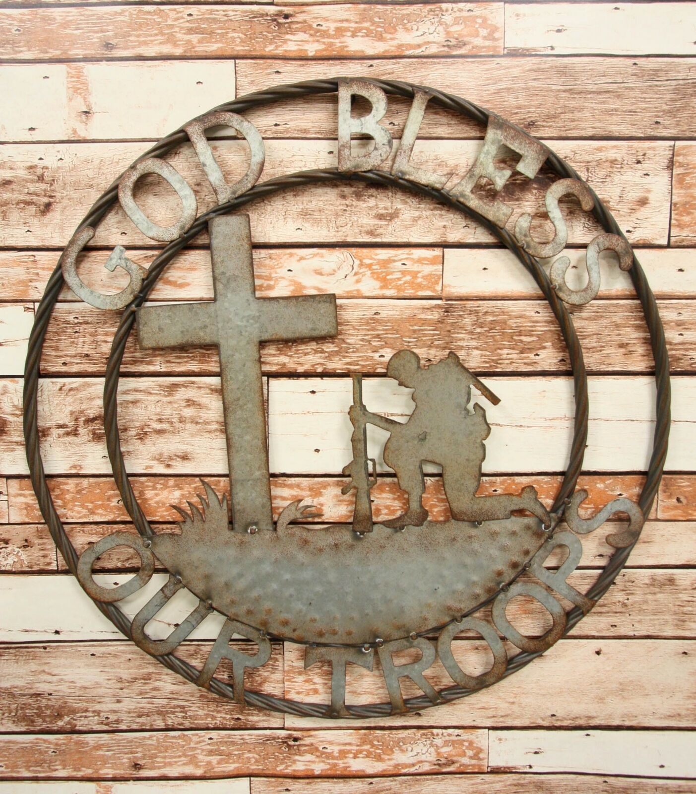 This oversized 2D wall art decor features a military soldier, kneeling before a cross at a battlefield in prayer. The greeting sign 'God Bless Our Troops' is placed above around the soldier scene to bring them to our remembrance. This sign is perfect for any Western or Southwestern rustic decor, whether it be faith based or strictly as a decorative centerpiece.