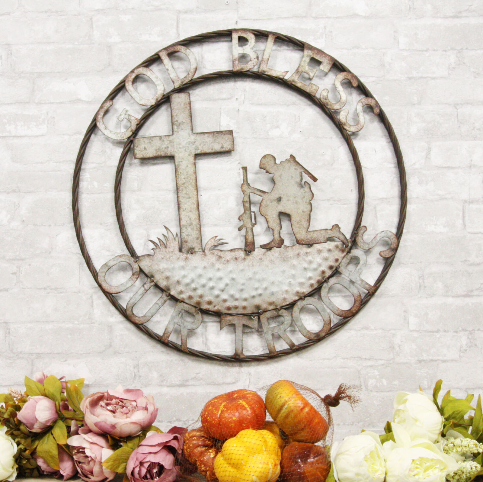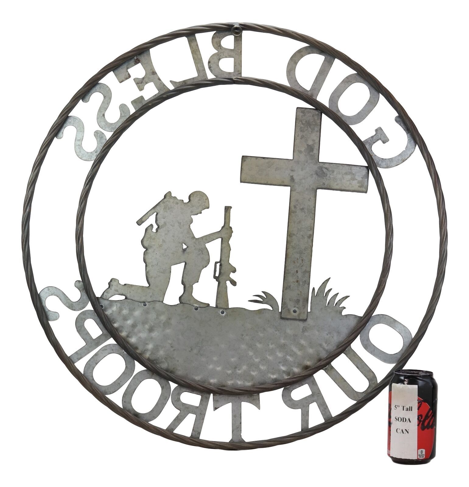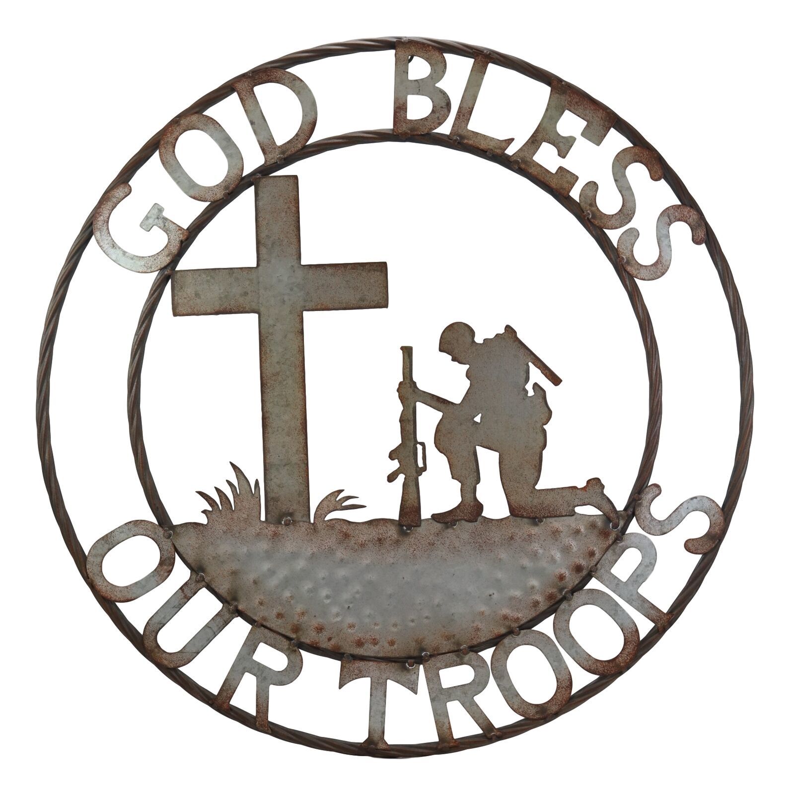 Oversized 24" Western God Bless Our Troops Sign Vintage Metal Circle Wall Decor