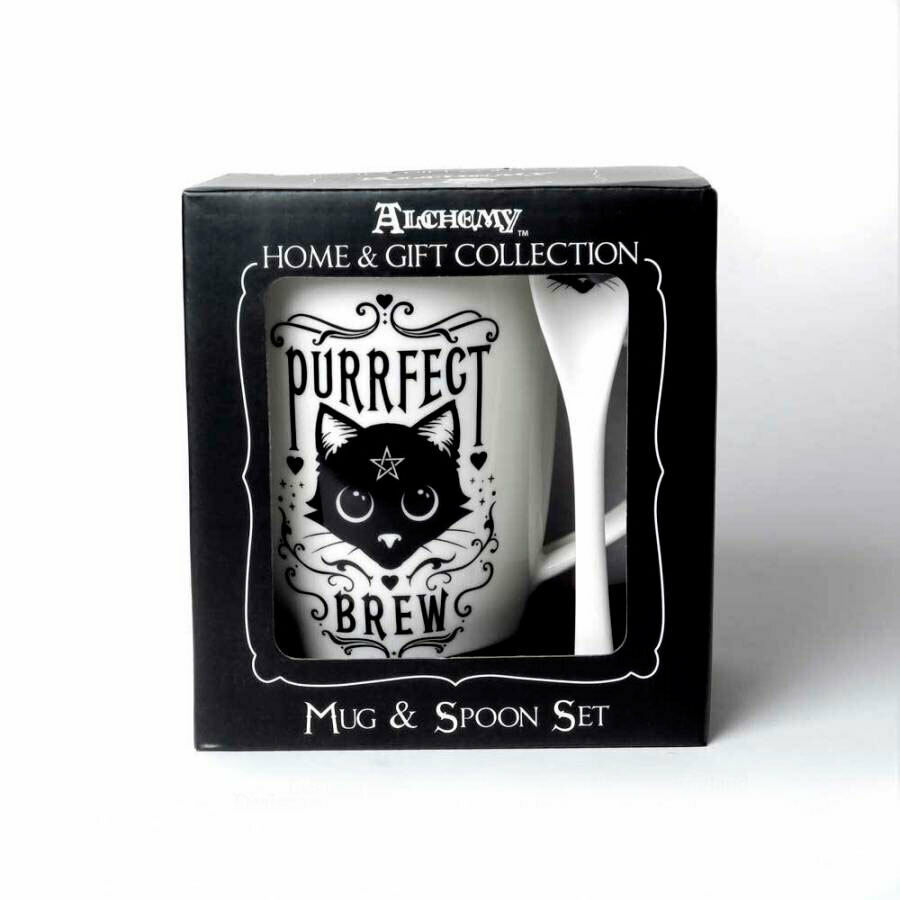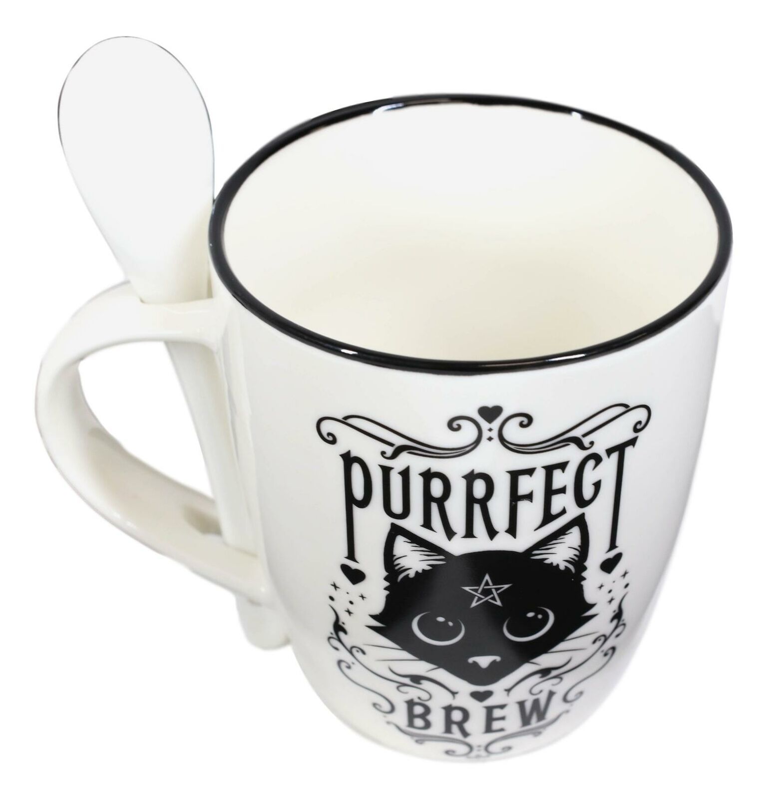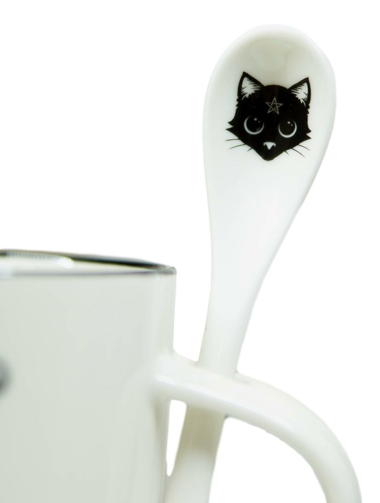 • Wow! The purrfect set for tea and coffee felinatics! Cause a stir with this awesome mug and spoon gift set! Curl up on the couch, sit back, relax and unwind with your favorite magical brew and your familiar on your lap. The artwork is in a classic black and white design featuring the iconic black cat. Each mug handle has a built in rest to hold the spoon in place when not in use.