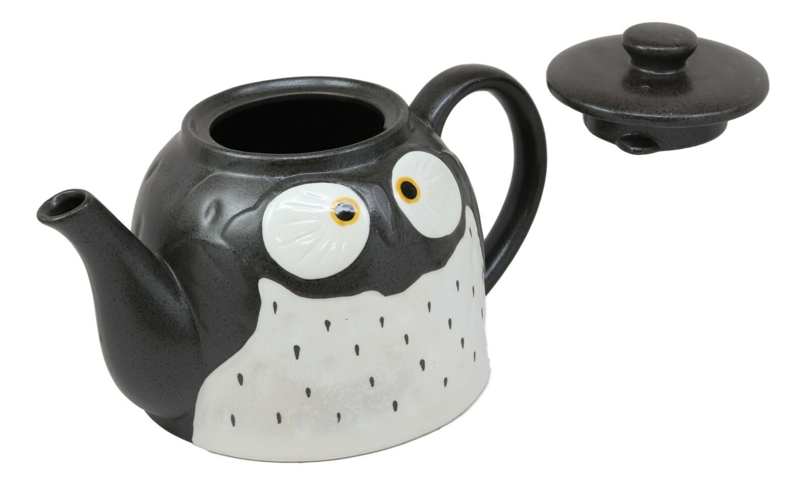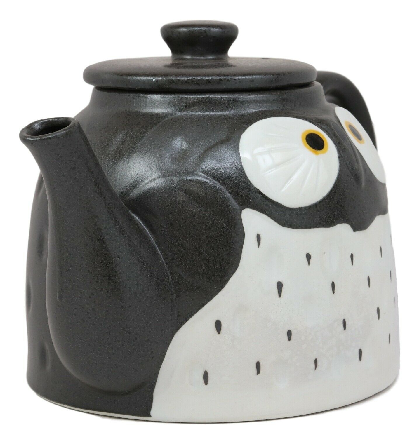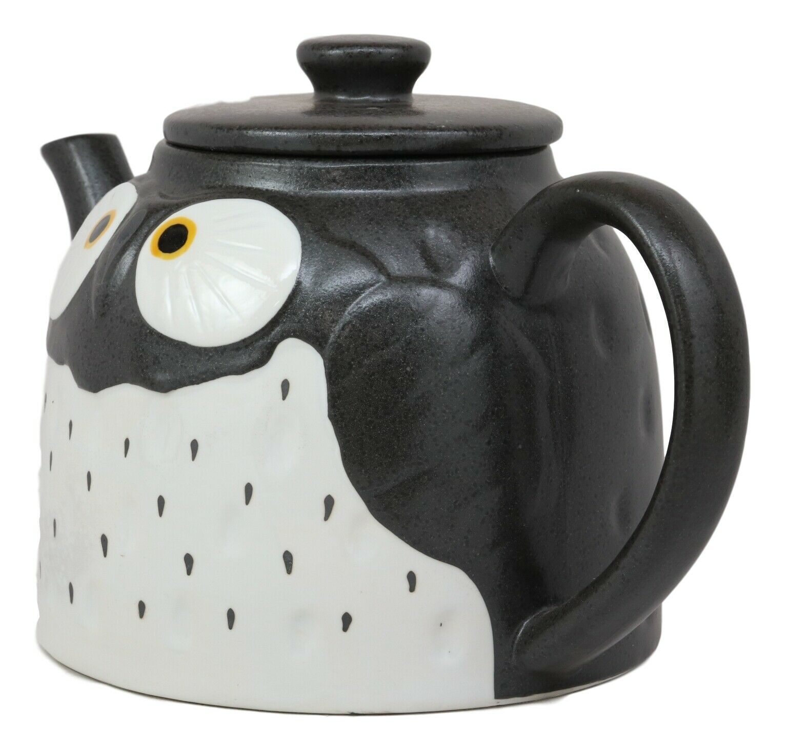 Whimsical Fat Black Owl Ceramic 52oz Large Tea Pot With Built In Strainer Spout