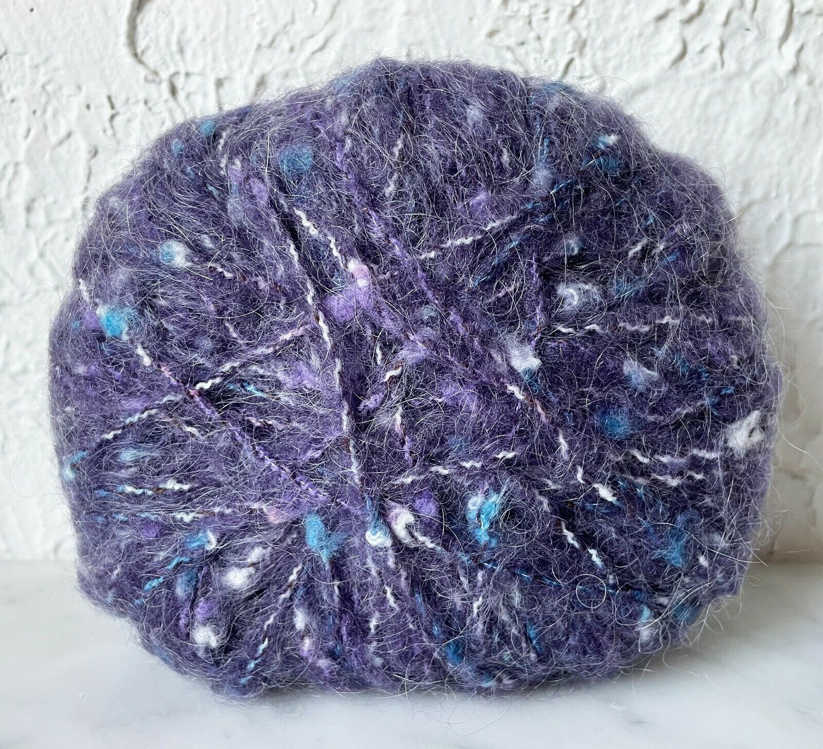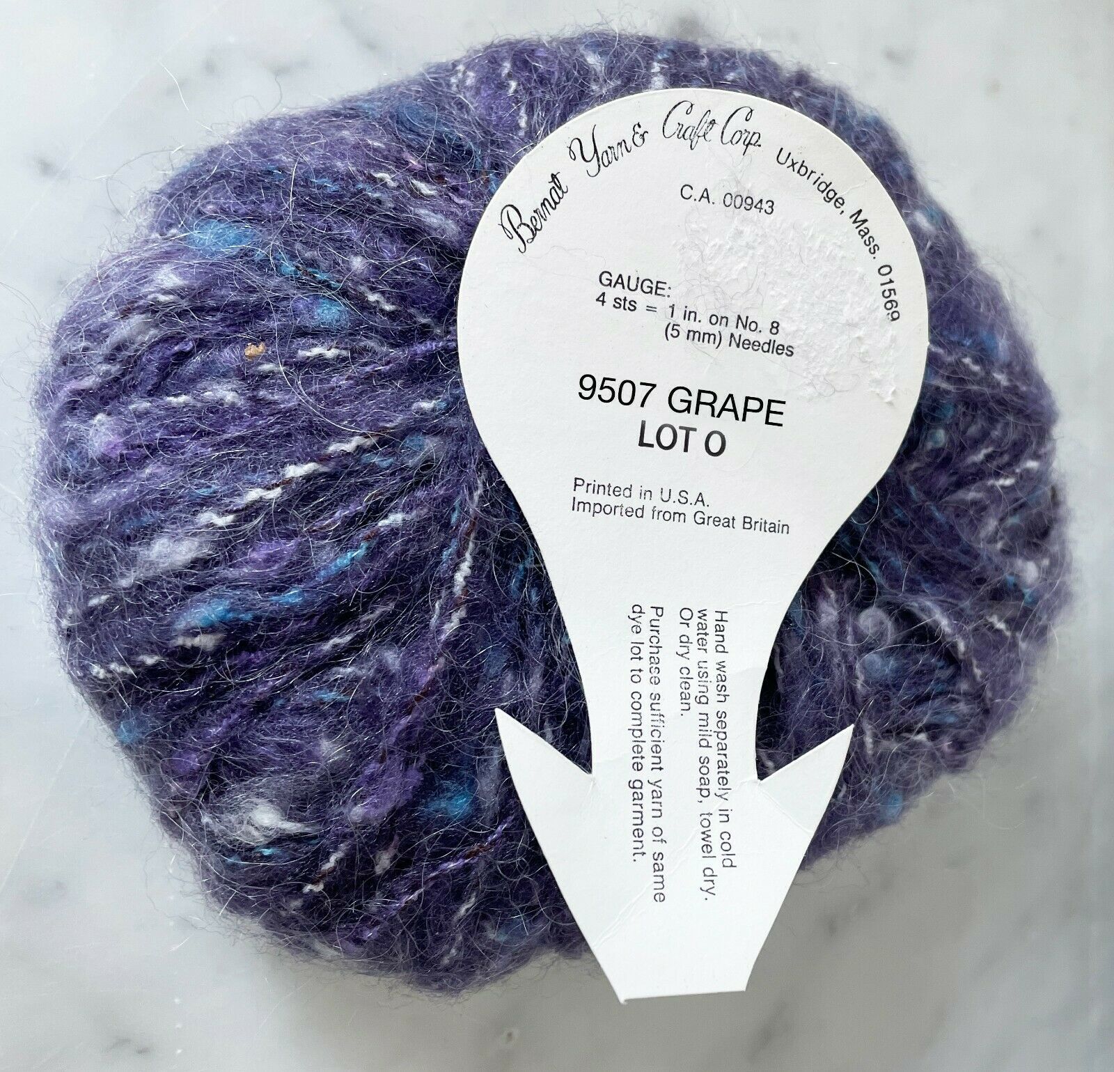 One ball/skein of Bernat Venetian yarn. Color Grape #9507. 71% Acrylic, 16% Mohair, 13% Nylon. Hand wash or dry clean.