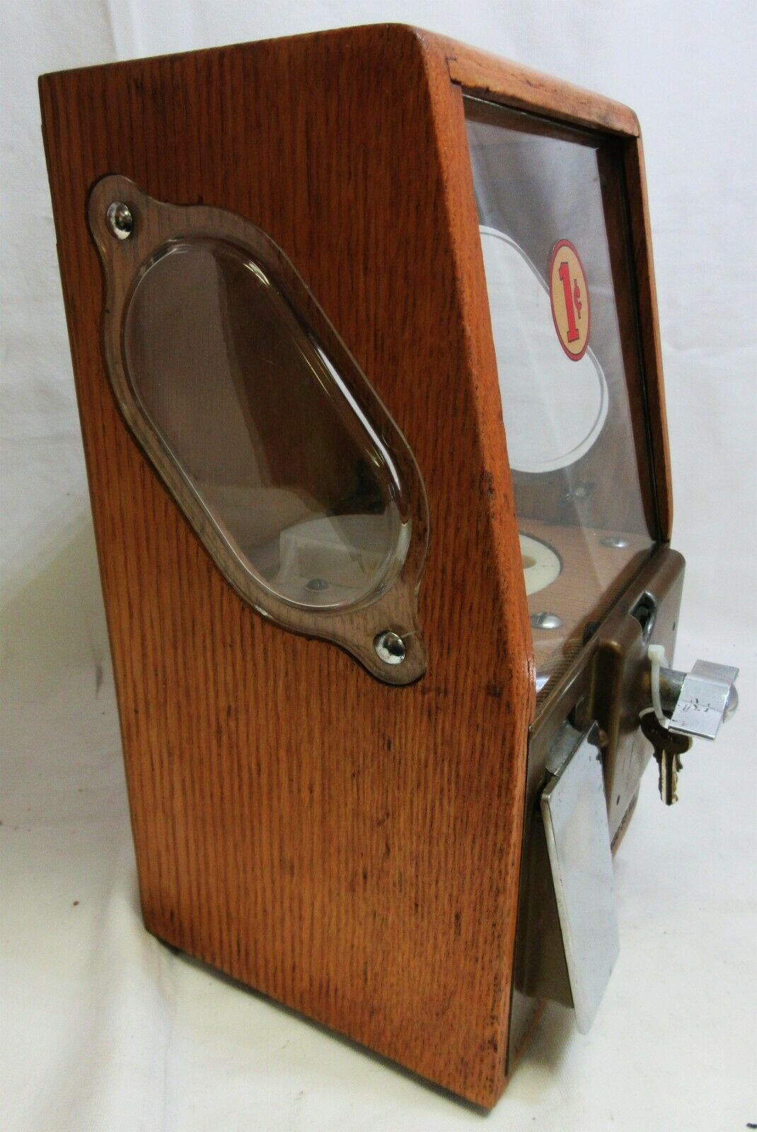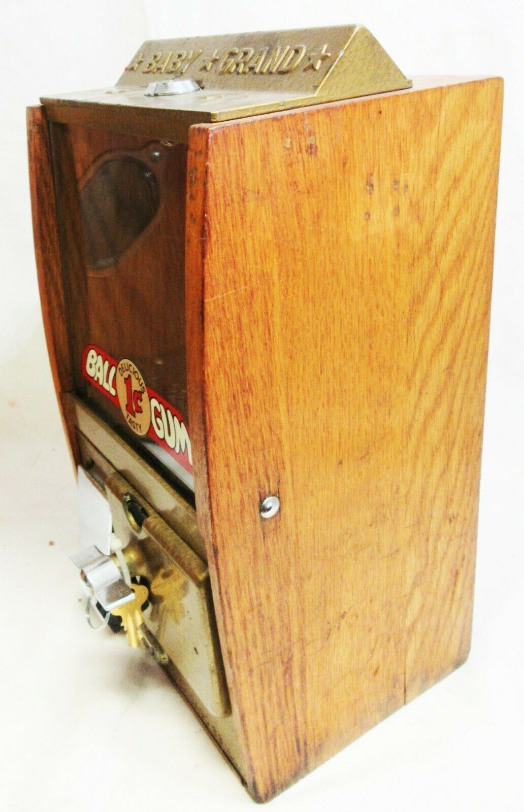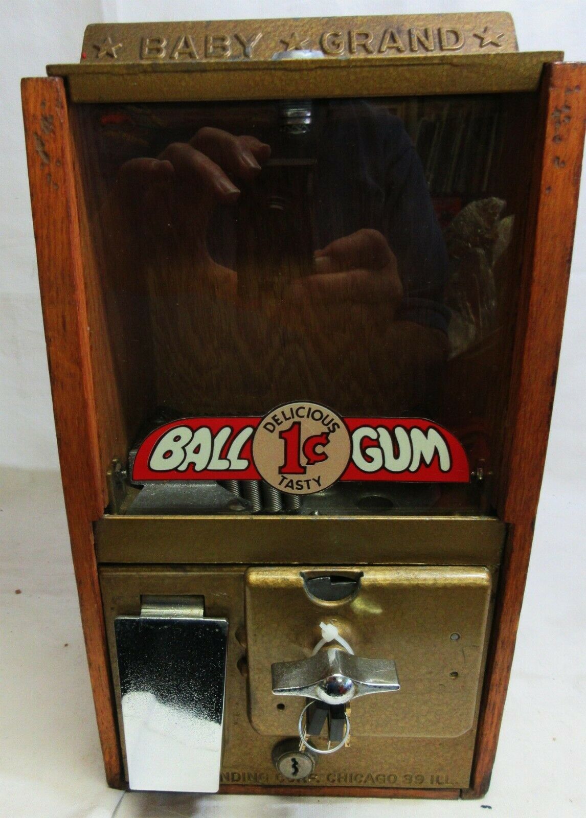 When a penny was deposited, the handle could be turned to release a gumball in the right chute.