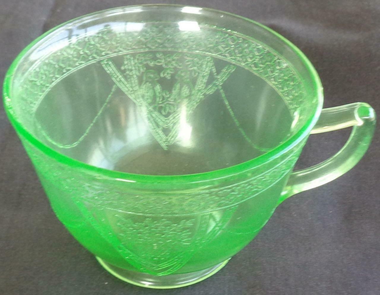 Offered Here is this Antique Federal Depression Glass Punch Cup. I am unsure of the age of the cup. It is in good condition, with no cracks, however, there are a couple of tiny chips on the top rim. The cup is a beautiful green color and is almost a Vaseline green. It has a beautiful design on it and is quite intricate. The cup is 2.5” tall, 2.25” deep, 3.5” in diameter at the top rim, 2” in diameter at the base ring, and the handle adds another 1” to that side. This is a beautiful antique Federal Depression Glass punch cup, in a rare design and color. It is the Georgian pattern. It would be a wonderful addition to any antique Depression glass collection.